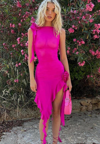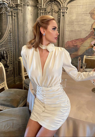 Looking for a more minimalist rosette trend? Thanks to the understated elegance of this dress, you can easily transition this flirty piece from day to night throughout the seasons. One way to keep all eyes on you this spring? Complete the look with a messy updo, oversized hoops, and ultra-smooth lips.