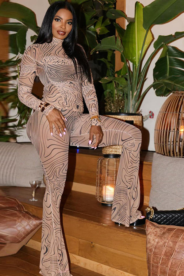 Camouflage Print Mesh Long Sleeve Top And Flared Pants Set