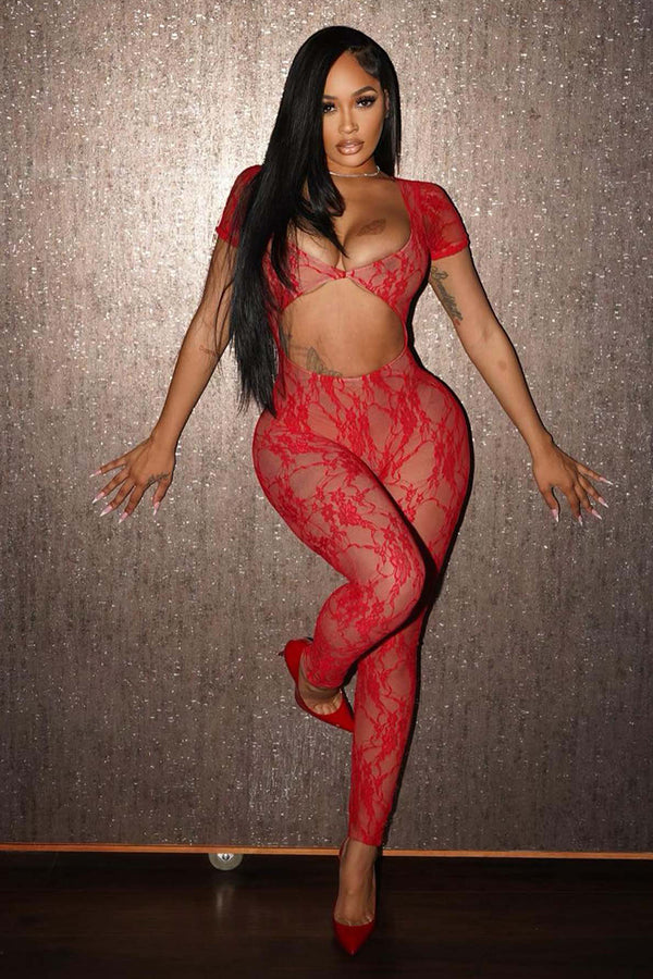 Lace Embroidery High Waist Flare Jumpsuit Long Sleeve