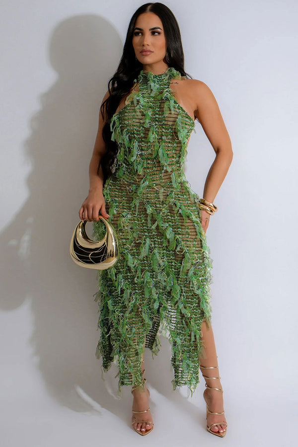 Product Details Material: Polyester, spandex Pattern: Tassel Neckline: High neck Sleeves: Sleeveless Detail: Hollow, backless Length: Midi Fit: Slim fit Season: Fall, winter Style: Sexy Care Instructions: Conventional wash Description...