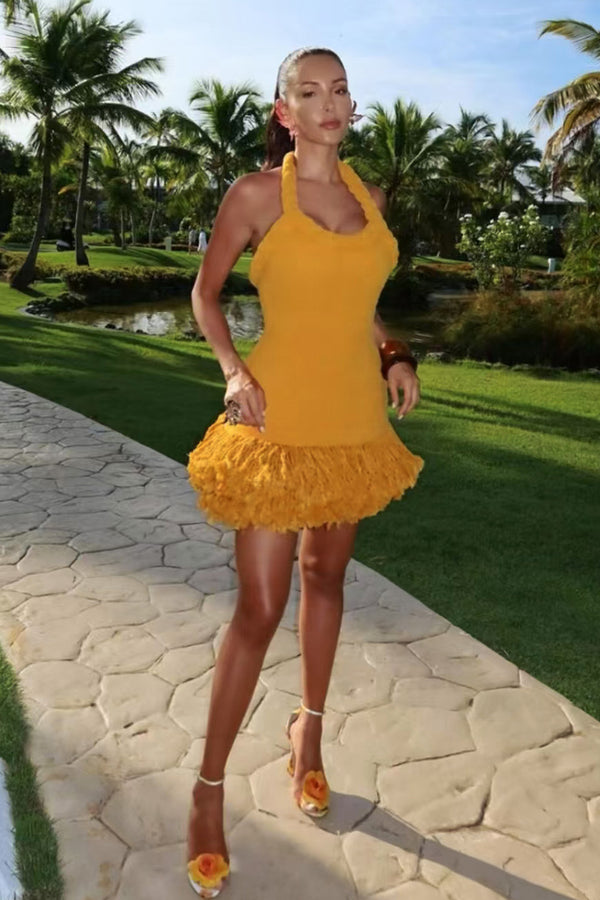High Neck Sleeveless Hollow Backless Tassel Patchwork Dress