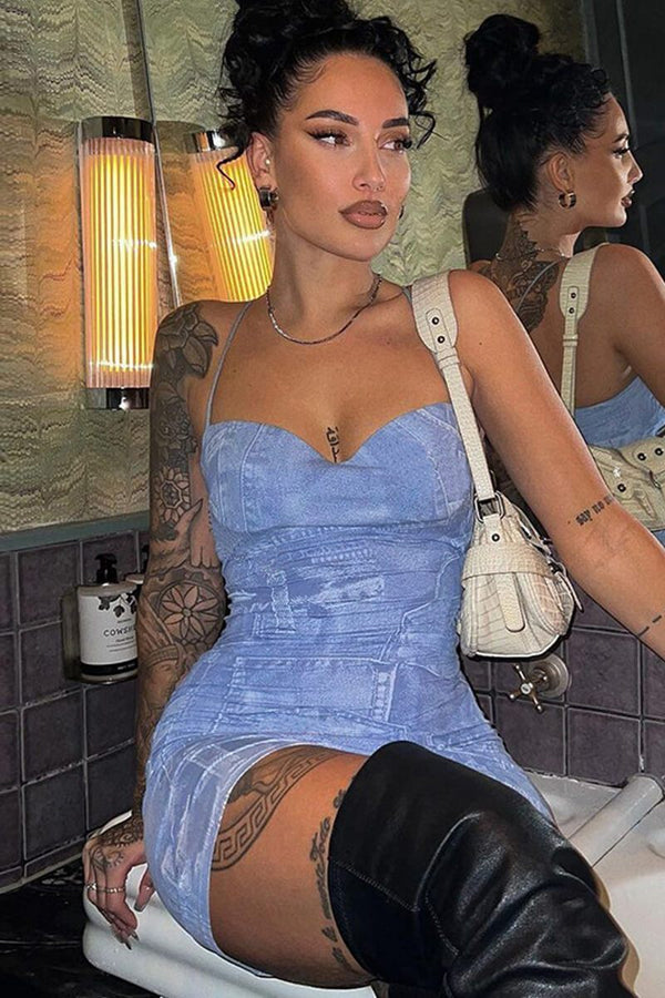 Material SpandexTie Dye Deep Cowl Neck Backless Mini Dress