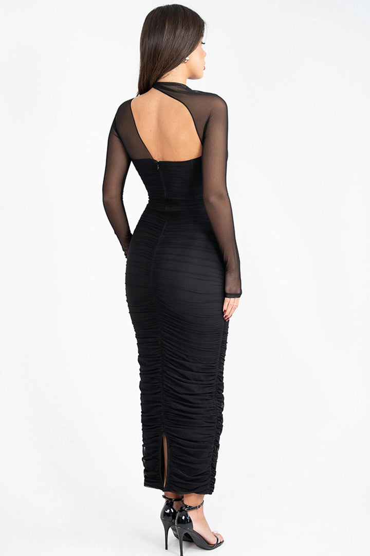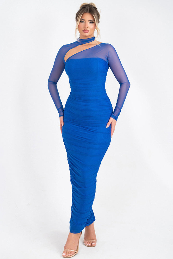 Mesh One Shoulder Long Sleeve Backless Ruched Dress