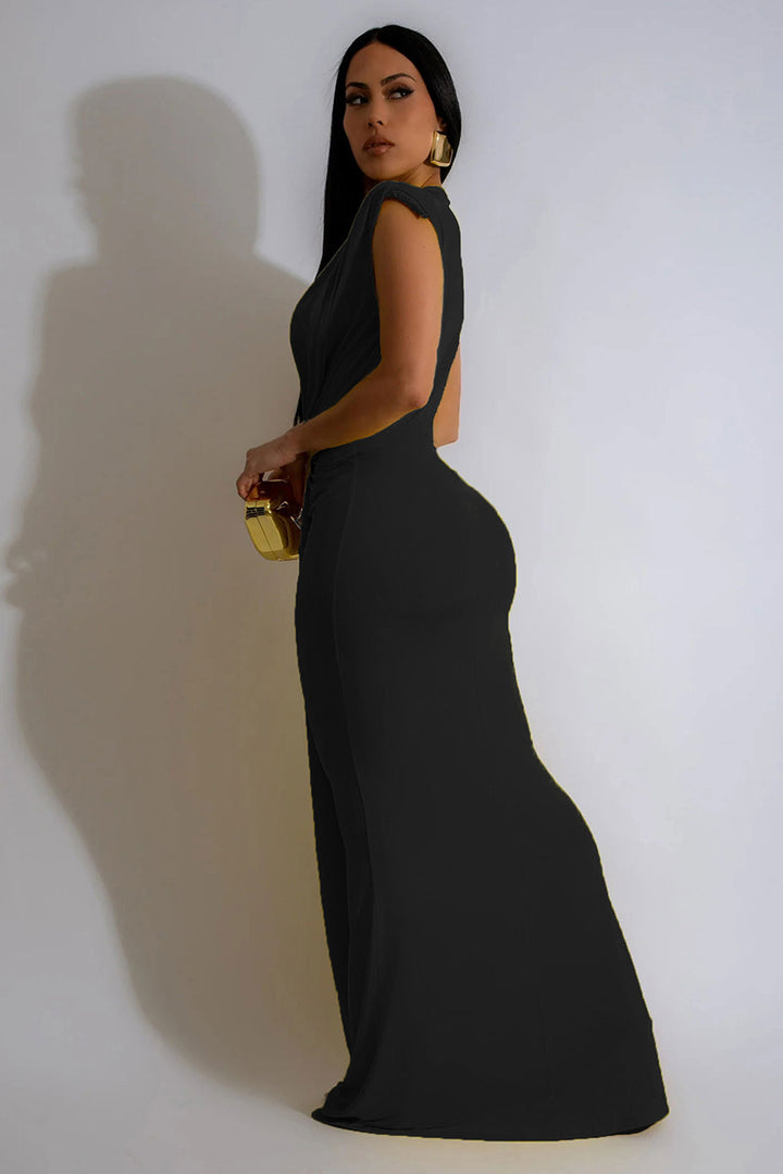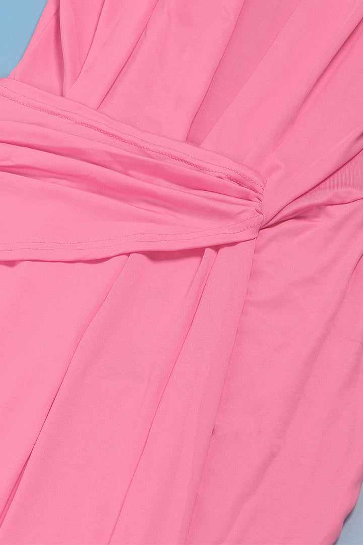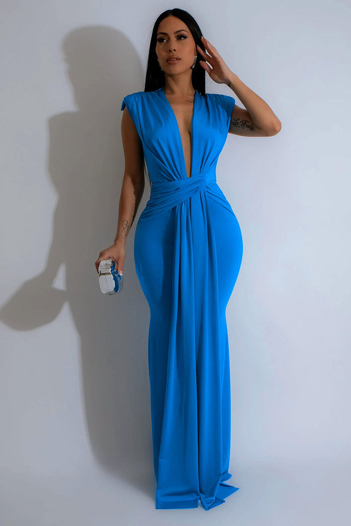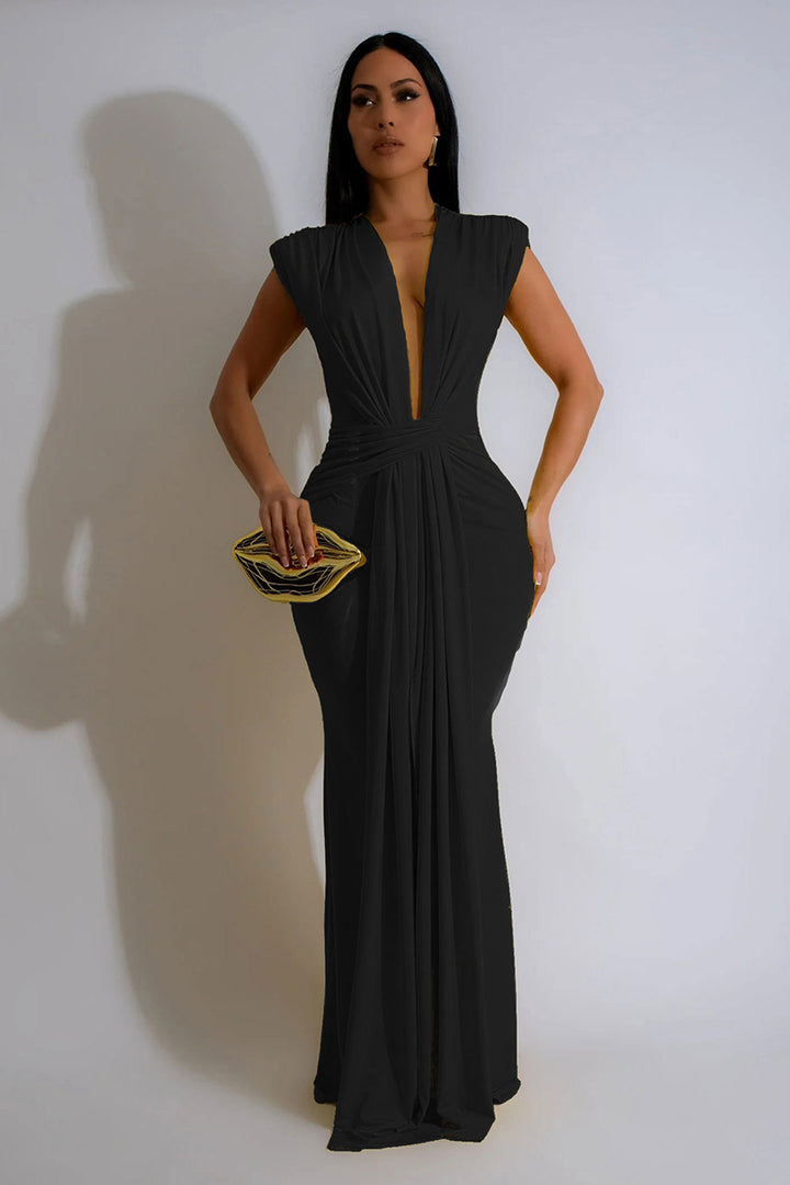 Sleeveless Deep V Neck Pleated Bodycon Maxi Dress