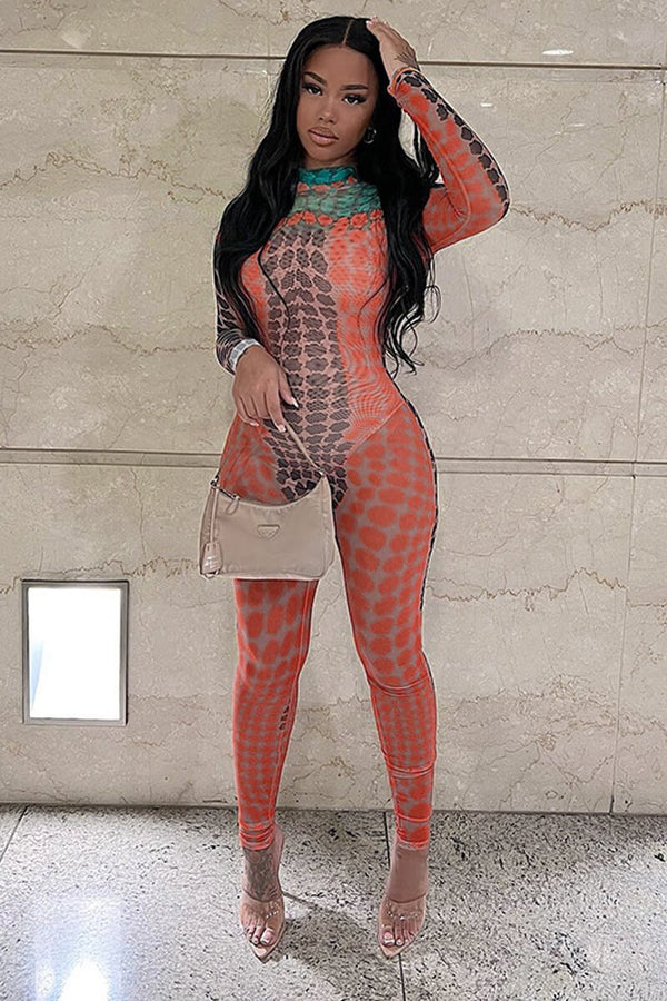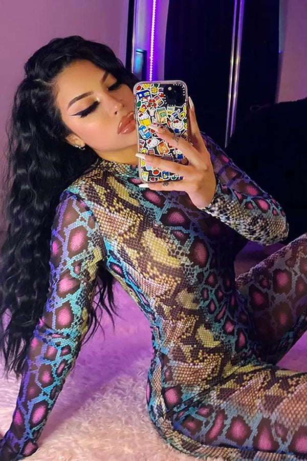 Colorful Snakeskin Print Bodycon Jumpsuit Long Sleeve