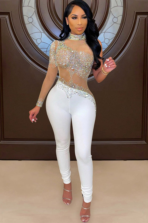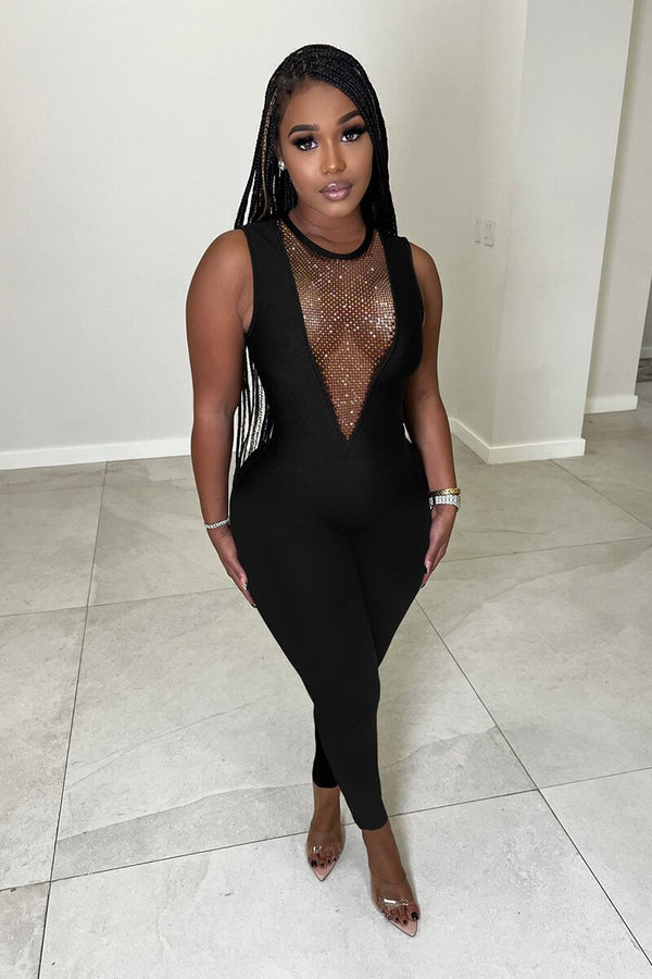 Mesh Skinny Cut Sleeveless Rhinestone Jumpsuit