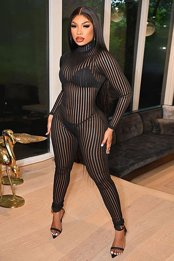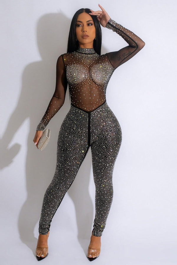 Black See Through Rhinestones Jumpsuit Long Sleeve