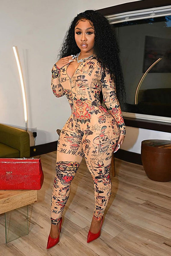 Allover Print Zipper Front Skinny Jumpsuit Long Sleeve