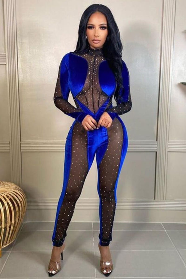 Sheer Mesh Velvet Patchwork Bodycon Jumpsuit With Sequins