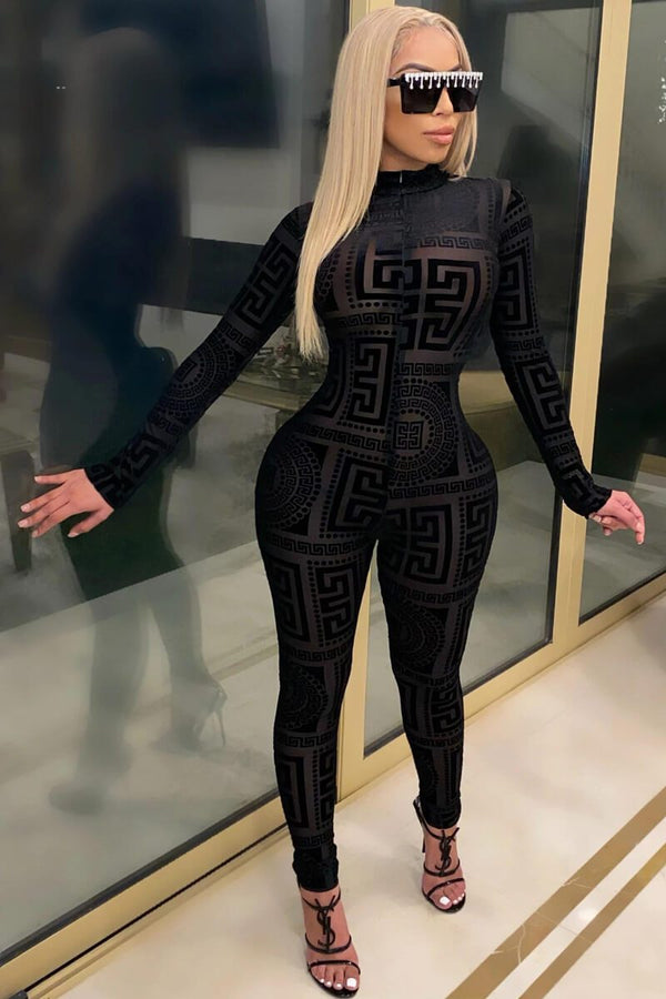 Mock Neck Geometric Print Skinny Jumpsuit Long Sleeve