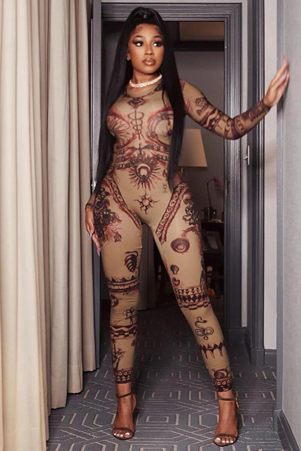 Vintage Geotic Print Bodycon Jumpsuit Long Sleeve