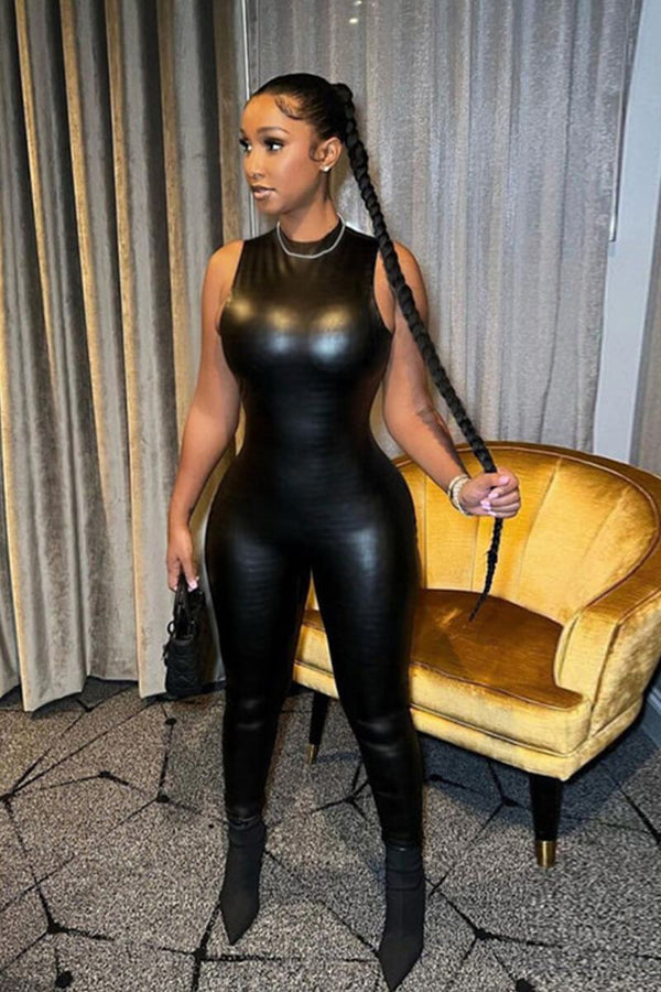 Black Sleeveless Leather Jumpsuit Mock Neck