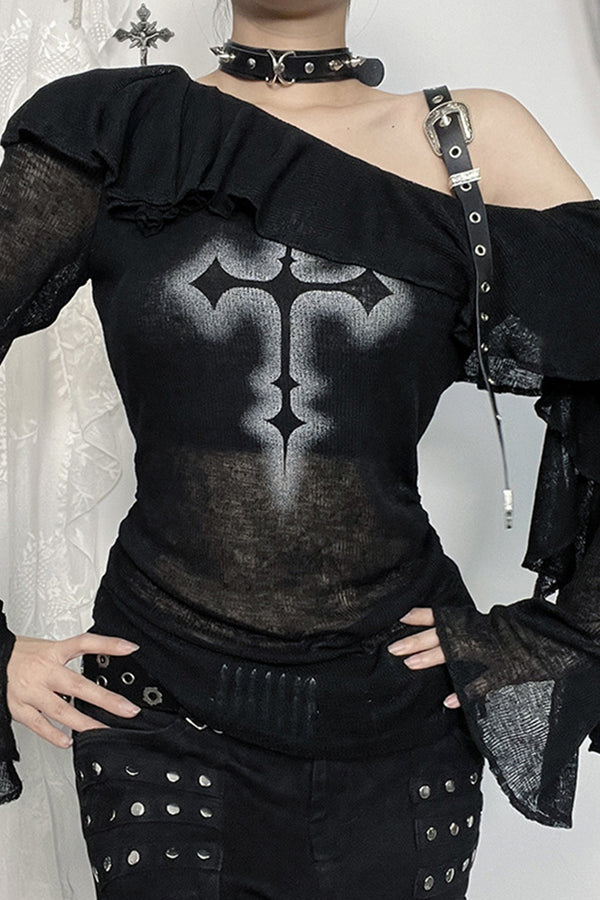 Mesh Sheer Trumpet Sleeve Asymmetric Hem Top