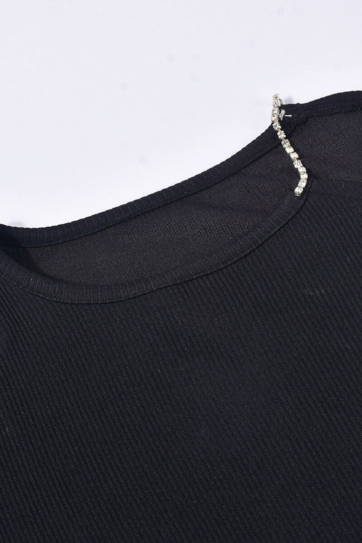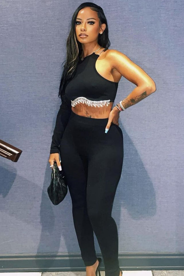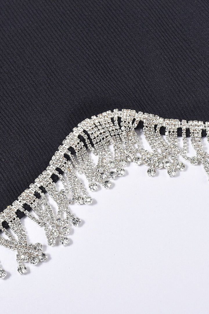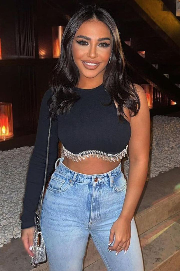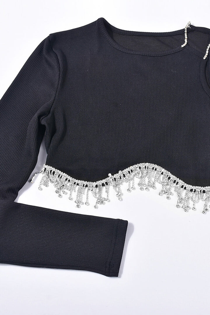 One Shoulder Rhinestone Fringe Ribbed Crop Top