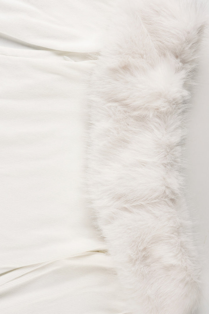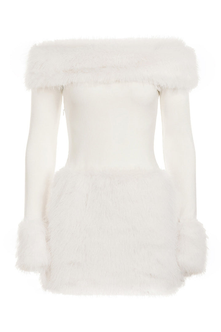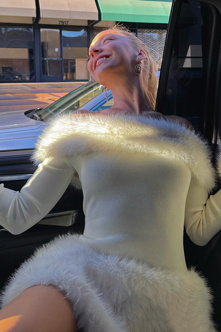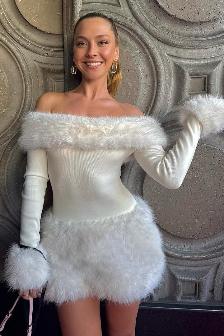 Faux Fur Trim Off Shoulder Knit Mini Dress