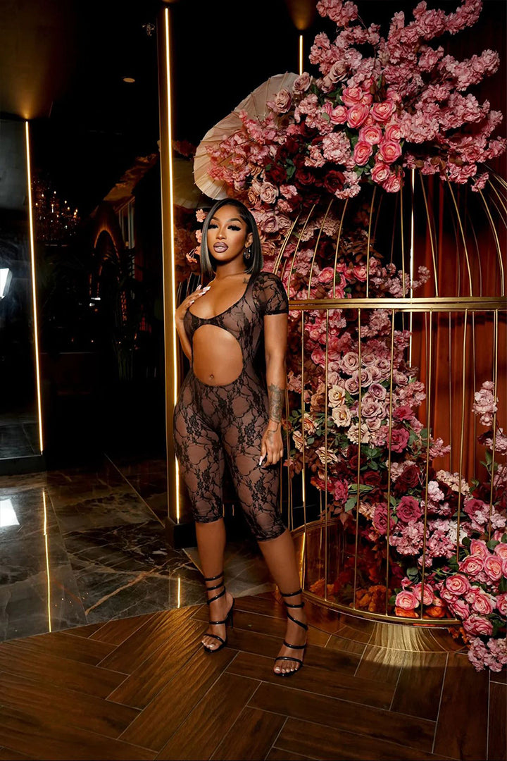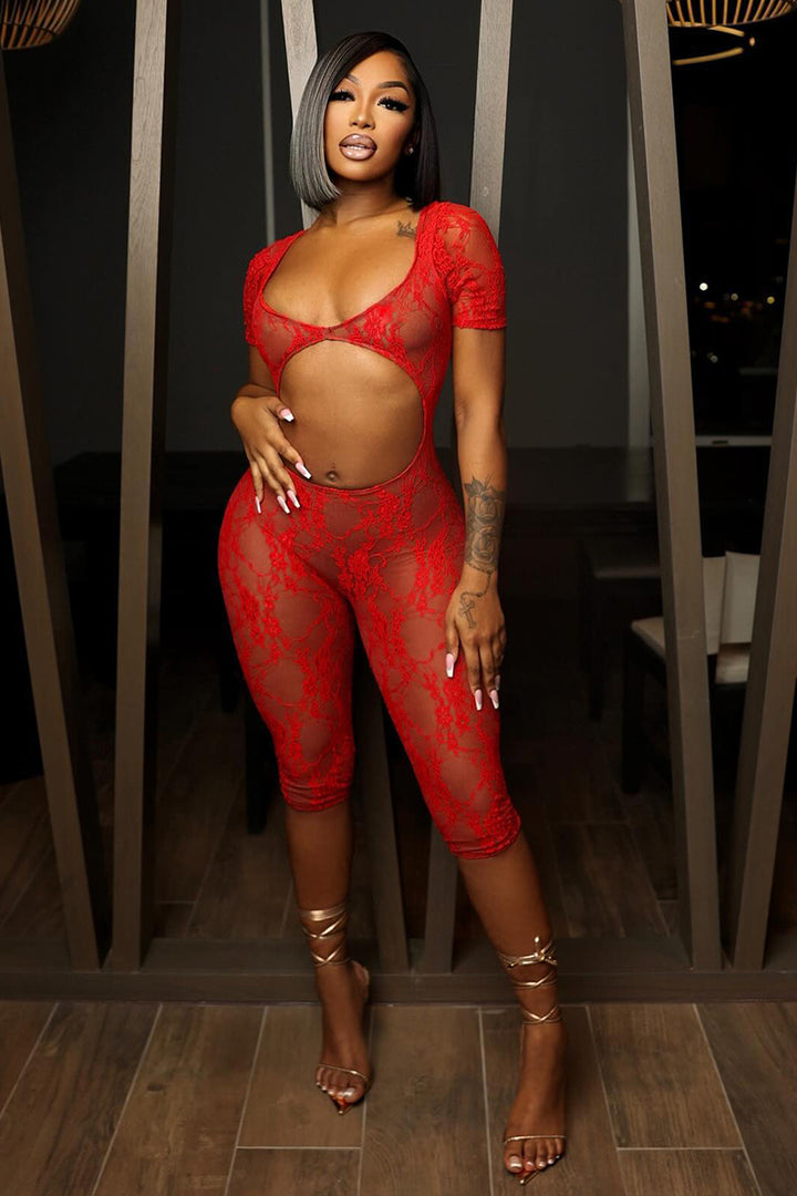 - This sultry romper exudes an undeniable sense of confidence and allure. The form-fitting silhouette hugs the model's curves, accentuating figure and creating a captivating visual statement.