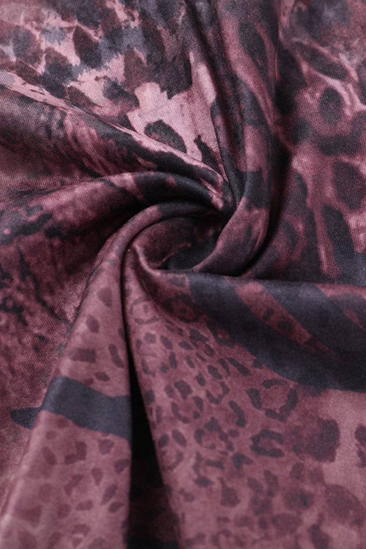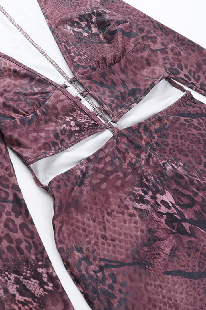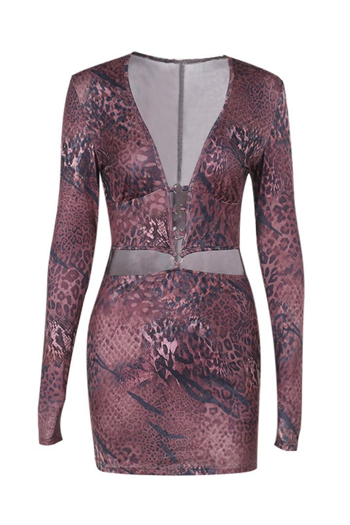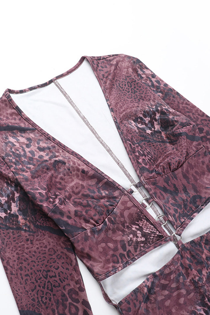 - Embrace bold sophistication with this leopard print dress, designed to captivate. The deep V-neckline and metallic ring detail add an edgy twist, while the body-hugging silhouette accentuates your curves flawlessly. Crafted from stretch-comfort fabric, this sleek midi dress offers confidence and allure for evening events or nights out. Pair with statement heels and minimal jewelry to let the pattern shine. Perfect for the fearless fashionista—blend untamed elegance with modern allure in this head-turning piece.