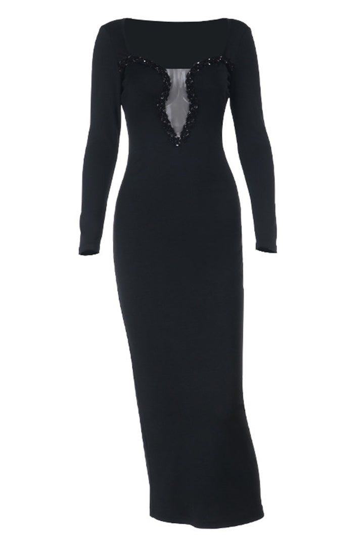 - Elevate your elegance with our stunning black maxi dress! The v neckline bodice features intricate lace - like details for a touch of allure. Long sleeves add a sophisticated element, while the form - fitting silhouette hugs your curves in all the right places. The mermaid - style skirt flows gracefully to the floor, making you stand out at any evening event or special occasion. Whether it's a date night or a cocktail party, this dress is your go - to choice for effortless charm and timeless beauty. Step into the spotlight and make a statement with this exquisite piece!
