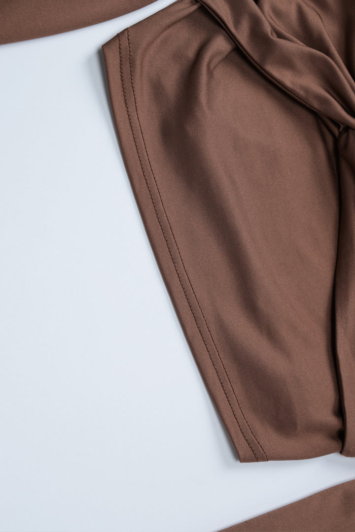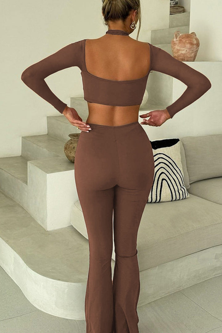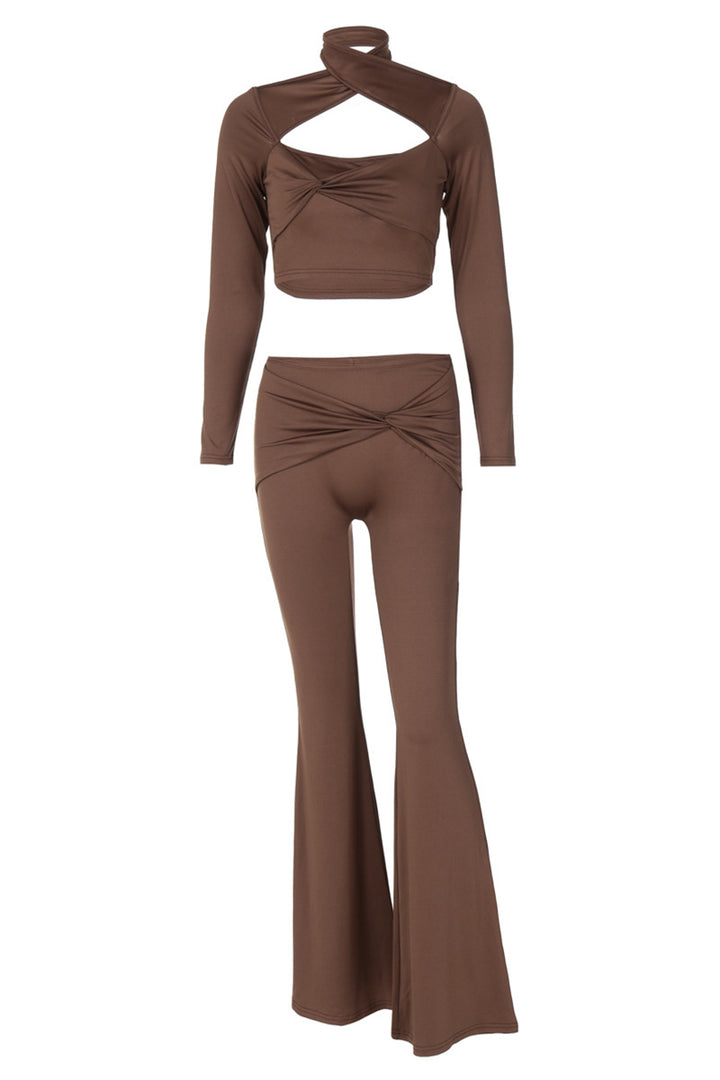 • Embrace effortless elegance in this chic brown pants set, designed to flatter your silhouette. The crossover neckline and subtle cutout detail add a touch of allure, while the long sleeves and high-waisted flared pants create a timeless, elongating effect. Crafted from premium fabric for comfort and movement, this set transitions seamlessly from daytime outings to evening events. Pair with heels and minimalist jewelry for a polished look that exudes confidence and modern sophistication.