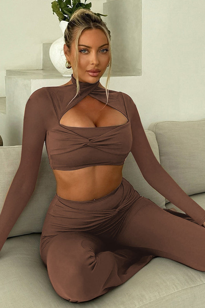 Cross Halter Long Sleeve Twisted Ruched Pants Set