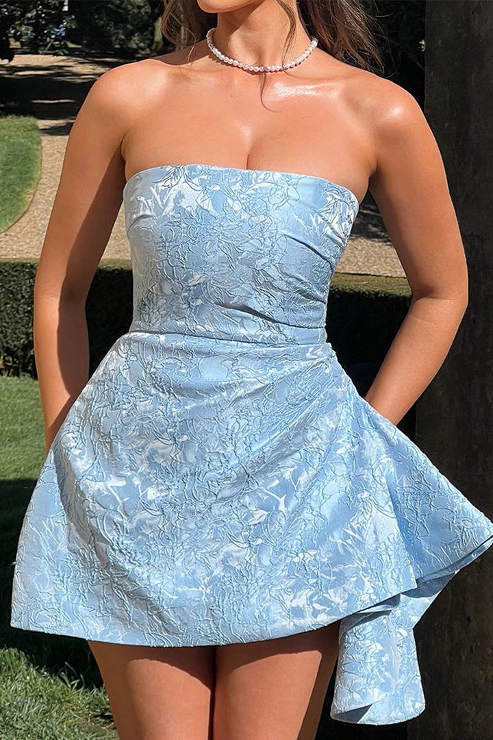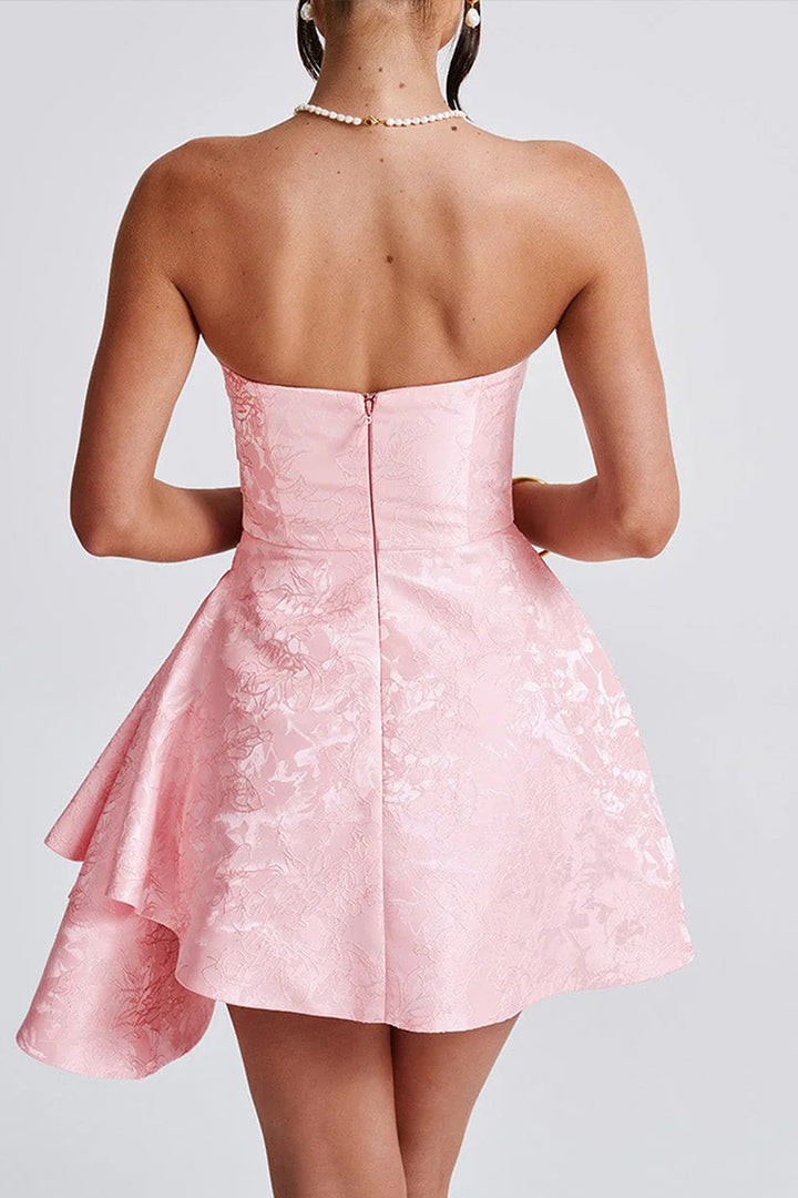 Floral Strapless Asymmetrical Ruched Hem Mini Dress