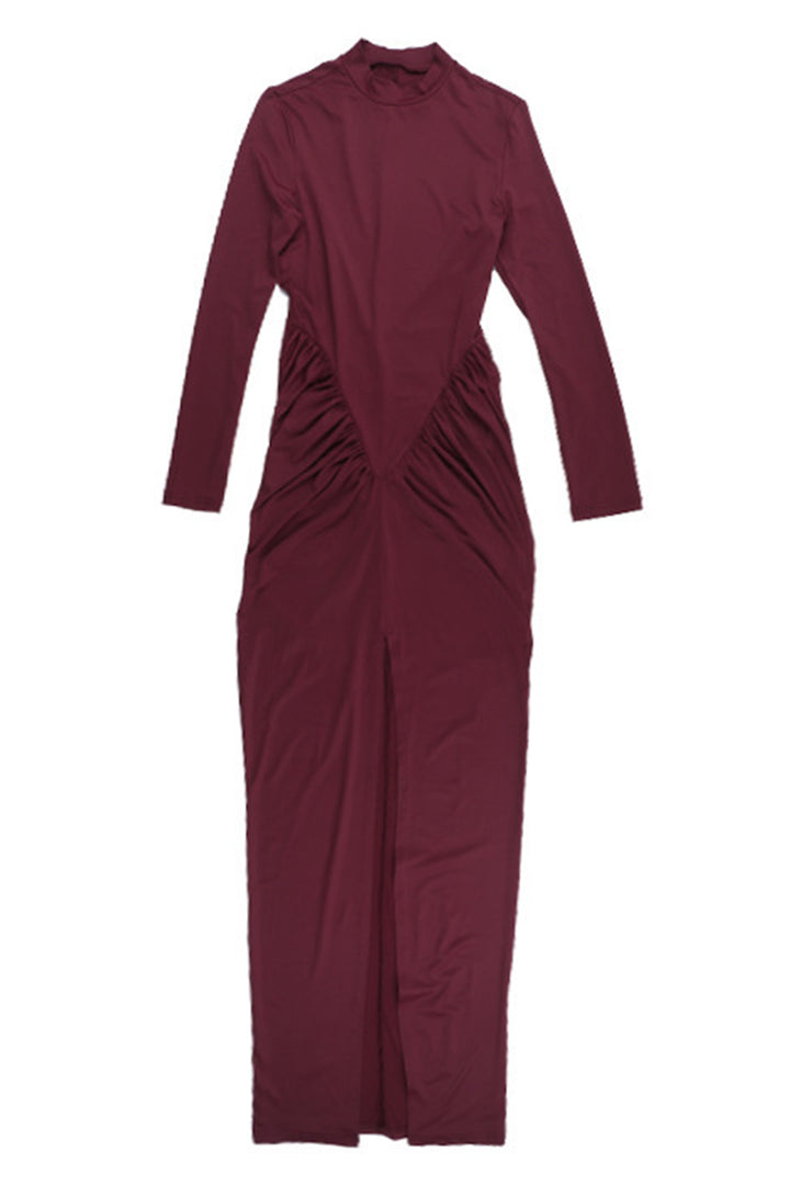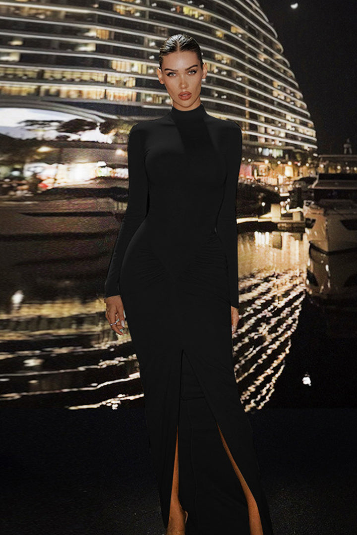- Step into the spotlight with our stunning maxi dress, designed for the modern urban queen. The form-fitting silhouette and daring high side slit accentuate your curves while offering effortless movement. Long sleeves and a high neckline add sophistication, perfect for city nights or exclusive events. Crafted from premium stretch fabric, it combines elegance with comfort. Pair with nude heels and statement jewelry to own the night. Embrace the allure of the skyline—this dress is your key to unforgettable moments.