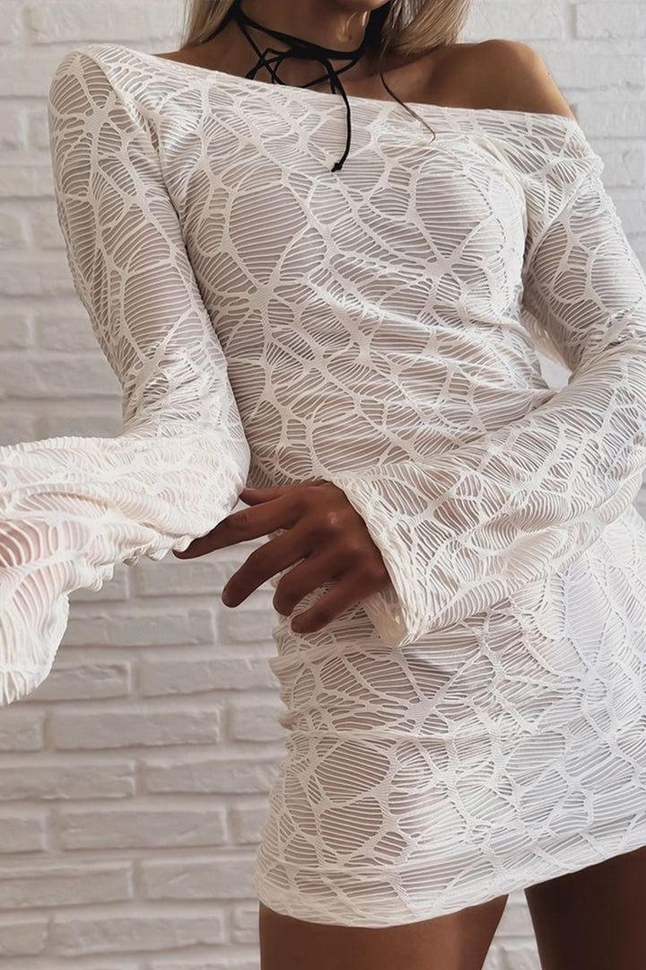 - Embrace timeless sophistication in this stunning white mini dress, crafted with intricate lace detailing and a flattering off-the-shoulder neckline. The long sleeves add a touch of refinement, while the body-hugging silhouette and shorter hem accentuate your curves with grace. Perfect for summer parties, romantic dates, or special occasions, this piece effortlessly blends allure with elegance. Pair with delicate jewelry and heels for a captivating look. Designed to make you feel confident and chic—own the moment in this unforgettable dress.