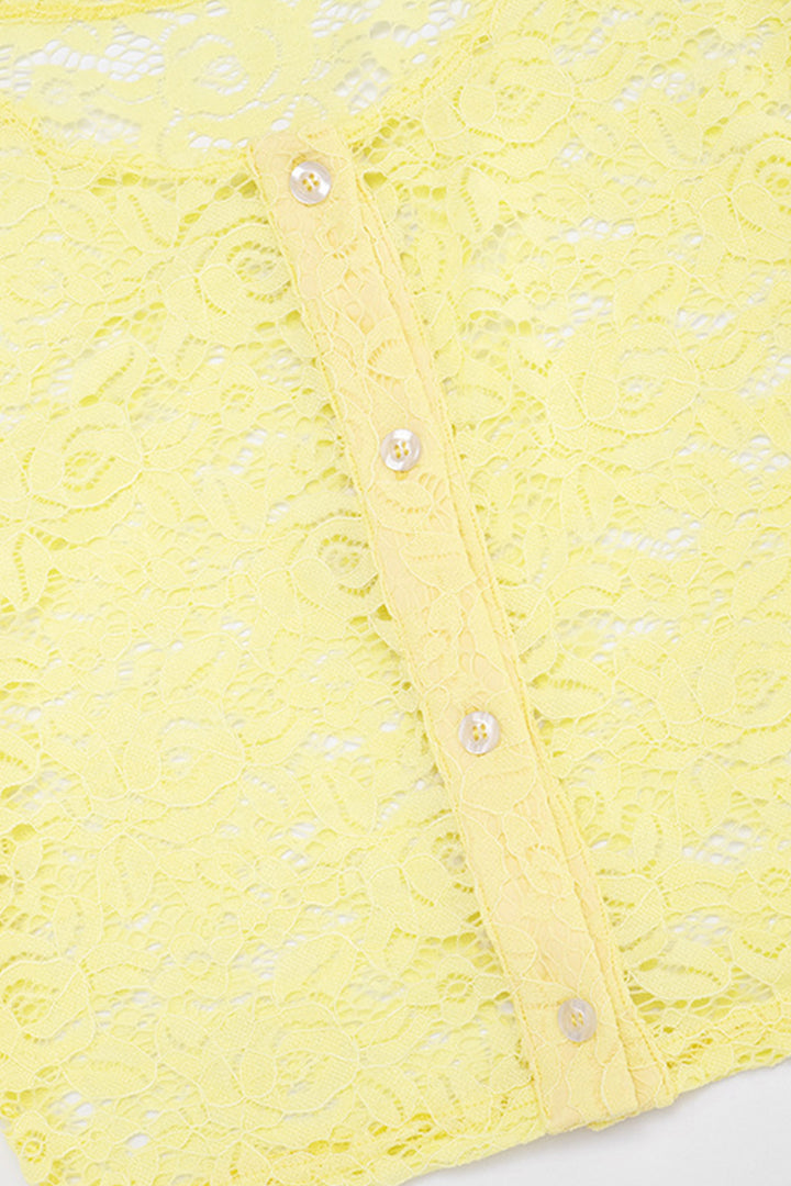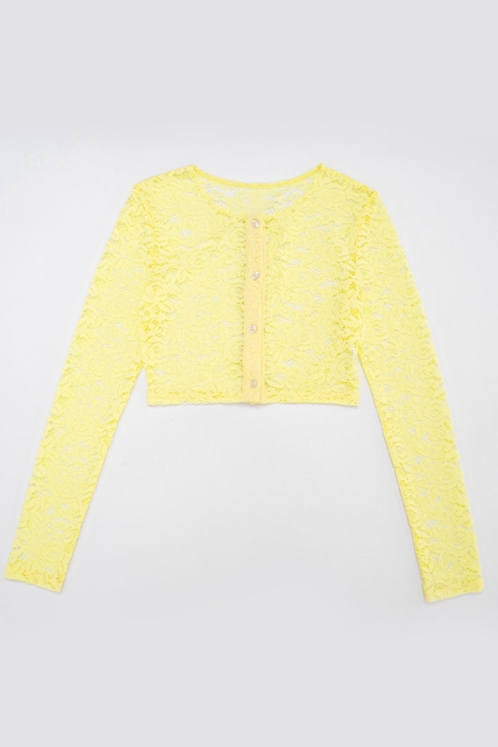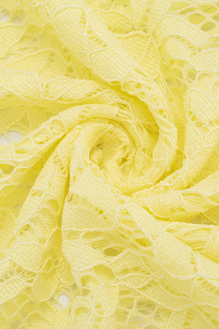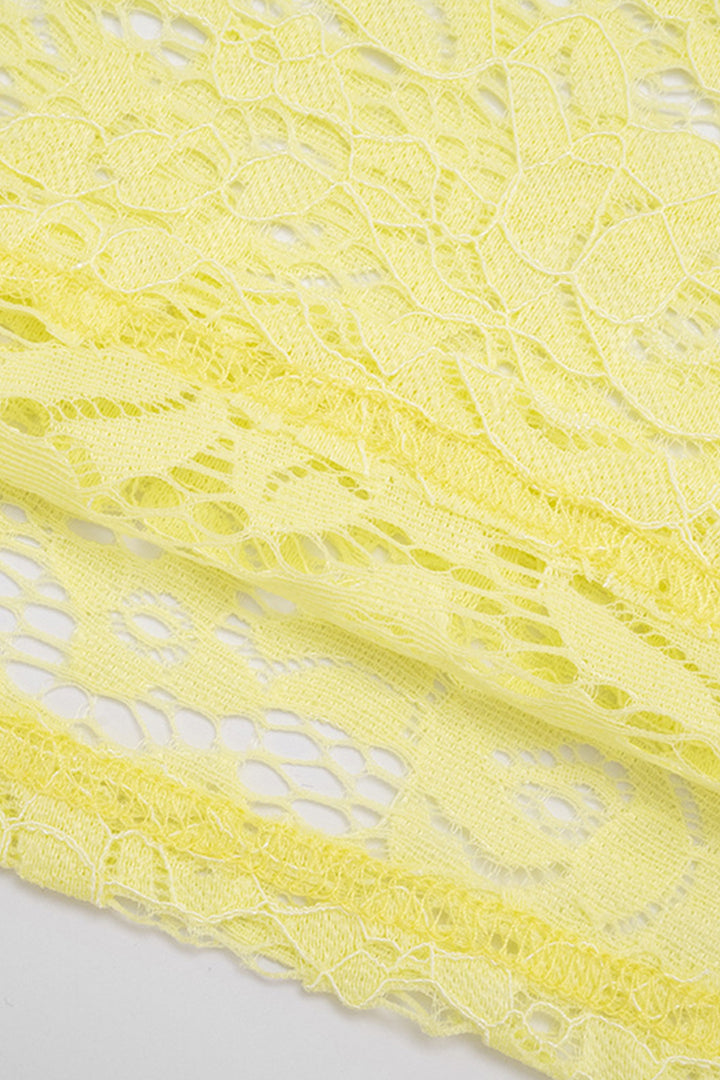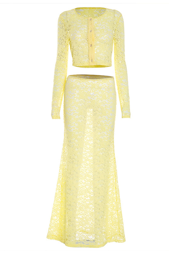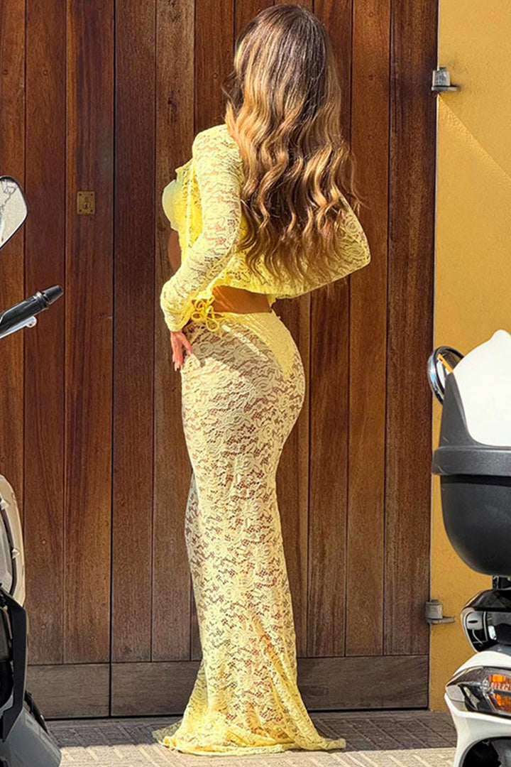- Embrace bold elegance in this stunning two-piece set, featuring a delicate lace bralette and a sleek open-front cardigan paired with a high-waisted trumpet skirt. The vibrant yellow hue exudes energy and sophistication, while intricate lace detailing adds a touch of romance. Perfect for summer soirées or statement occasions, this set sculpts your silhouette with effortless grace. Layer it for daytime charm or dazzle solo at evening events—versatility meets high fashion. Crafted for the fearless and fabulous, this ensemble turns heads and radiates joy. Own the sunshine!