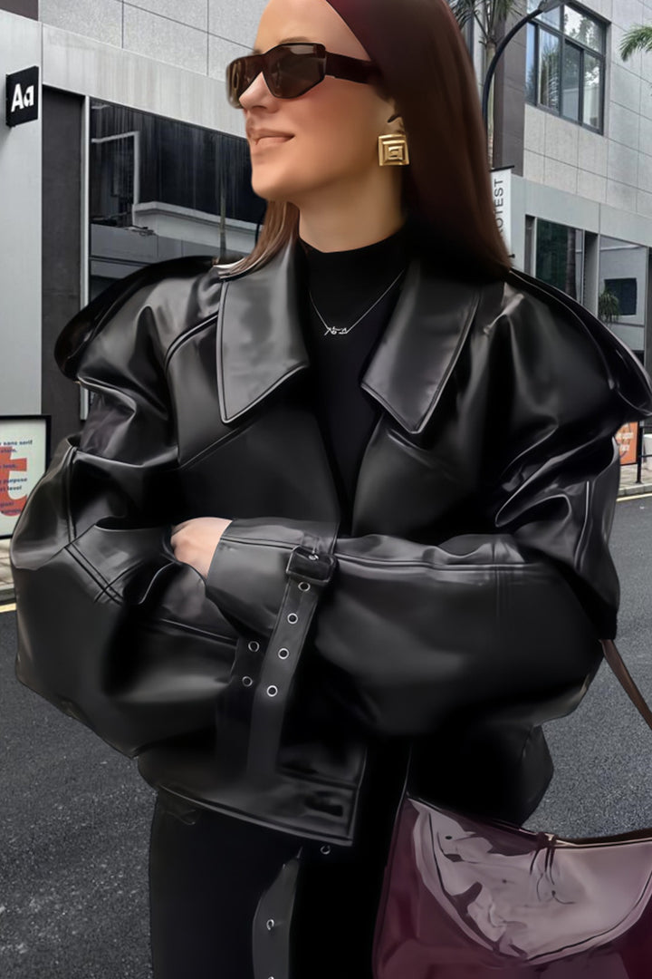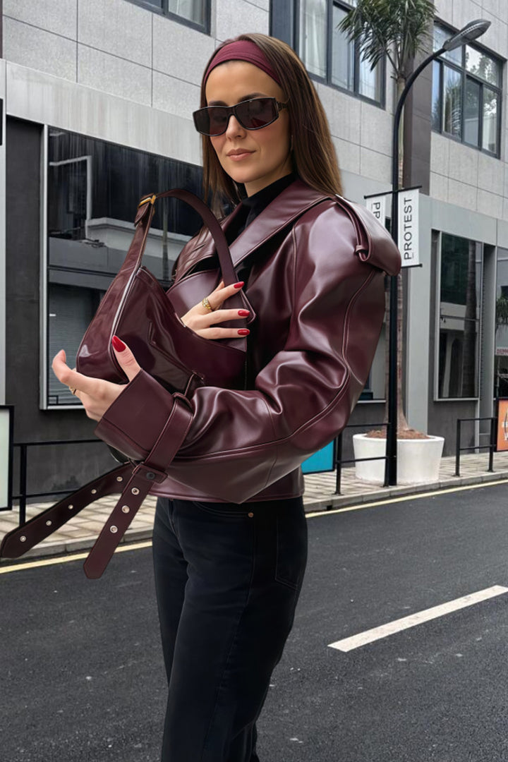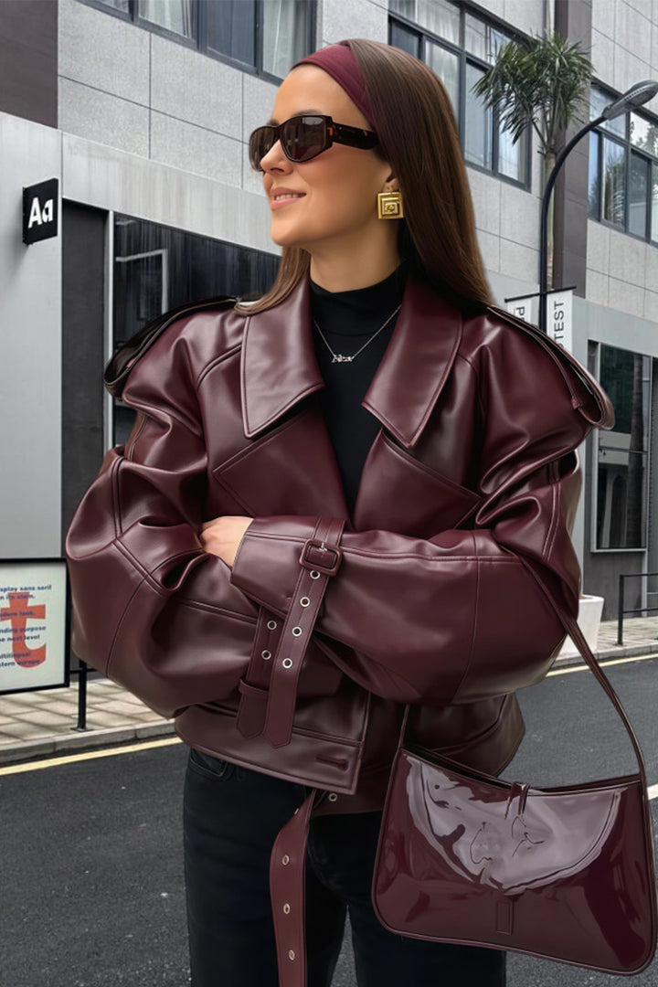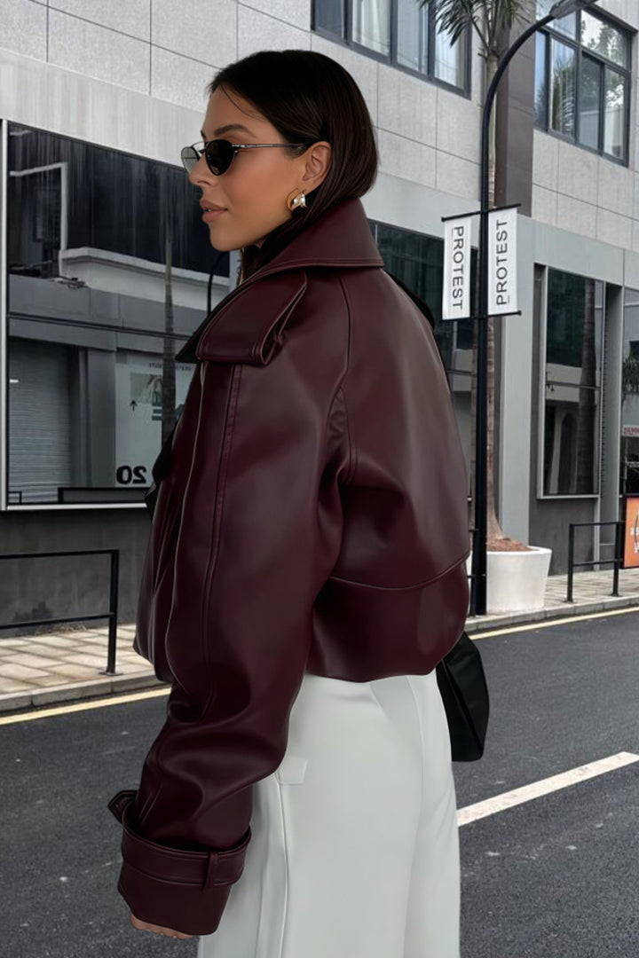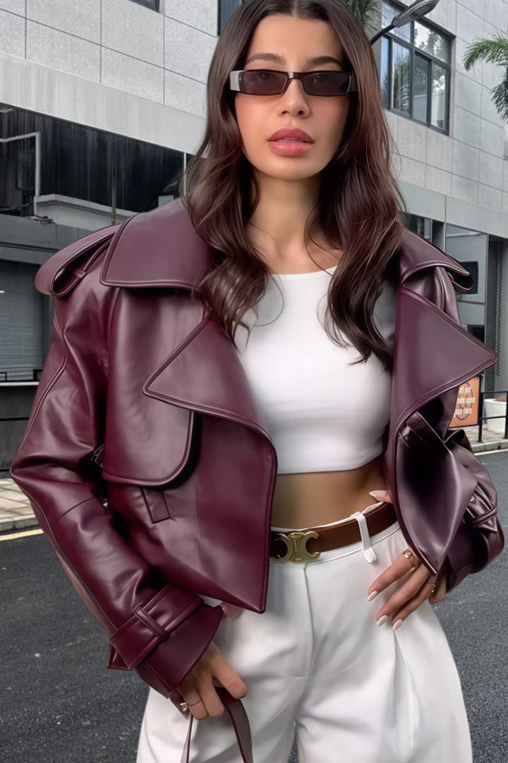 - Make a statement in our leather jacket, crafted for the modern trendsetter. Designed with a cropped silhouette and wide lapels, this piece exudes confidence and edge. The supple, high-quality leather ensures both comfort and durability, while the rich wine hue adds a touch of sophistication. Perfect for pairing with jeans or layering over dresses—it effortlessly transitions from day to night. Unleash your inner icon with this versatile, head-turning essential.