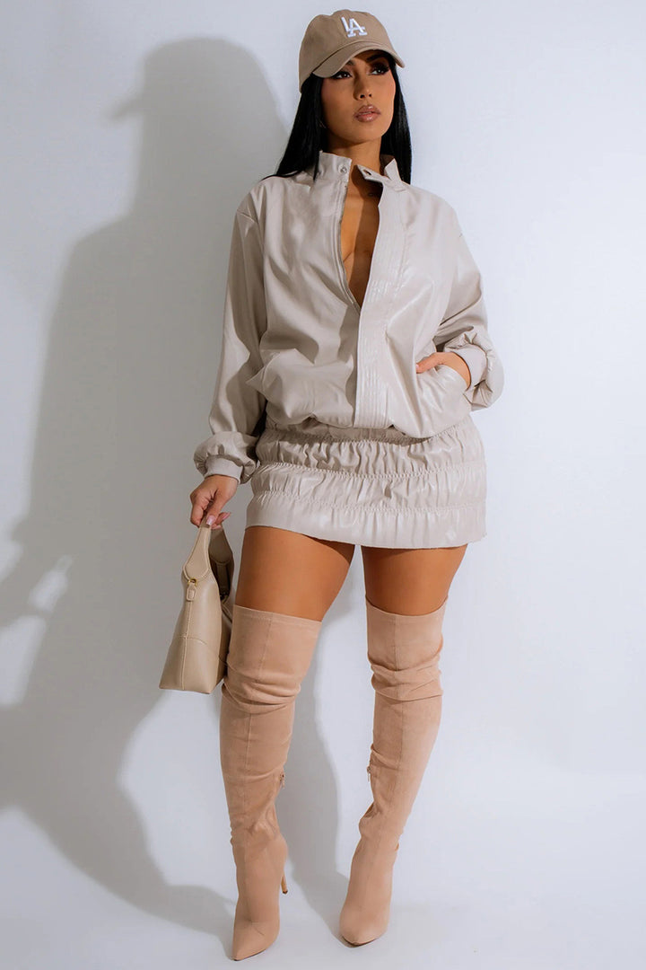 Leather Zipper Jacket And Mini Pleated Skirt Set