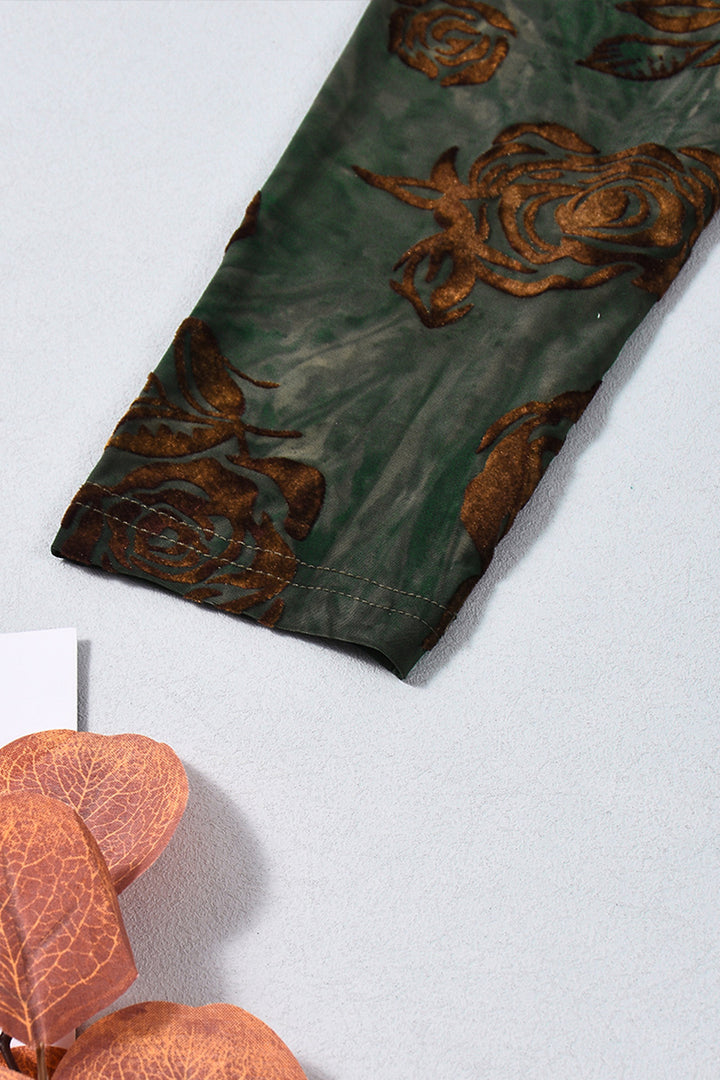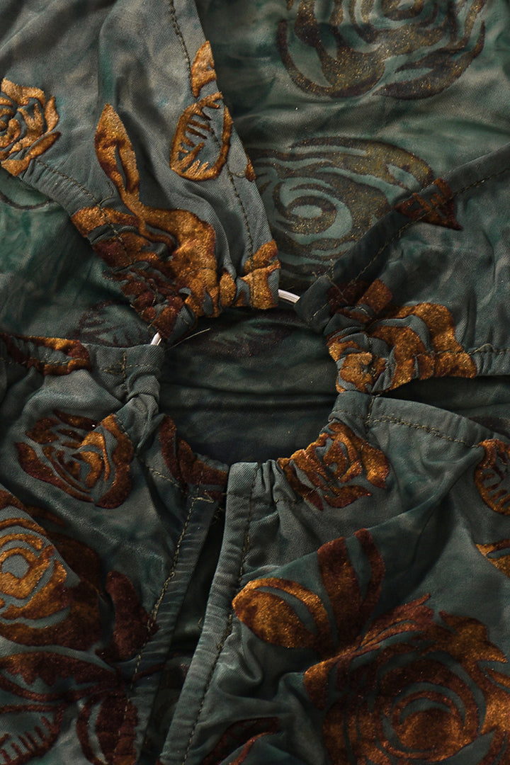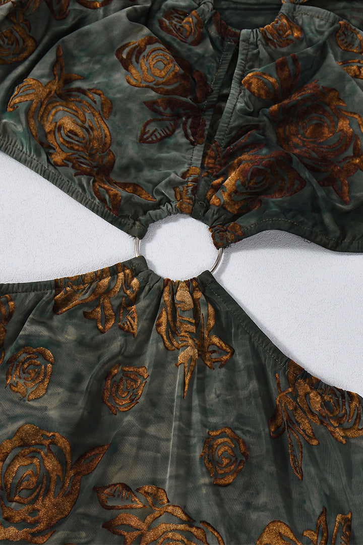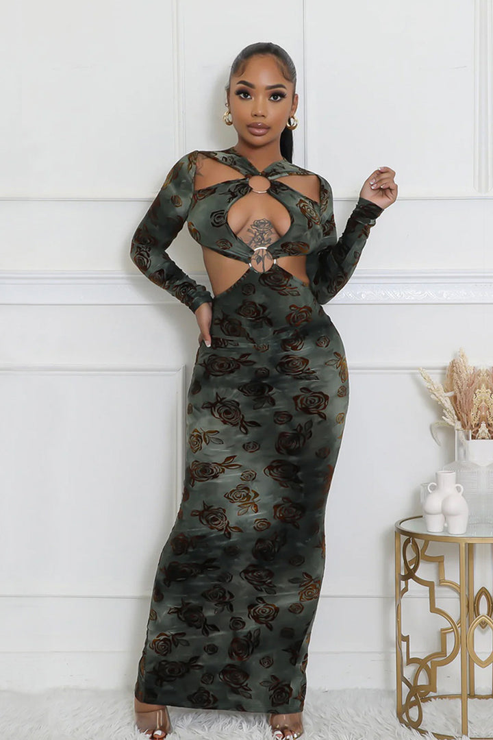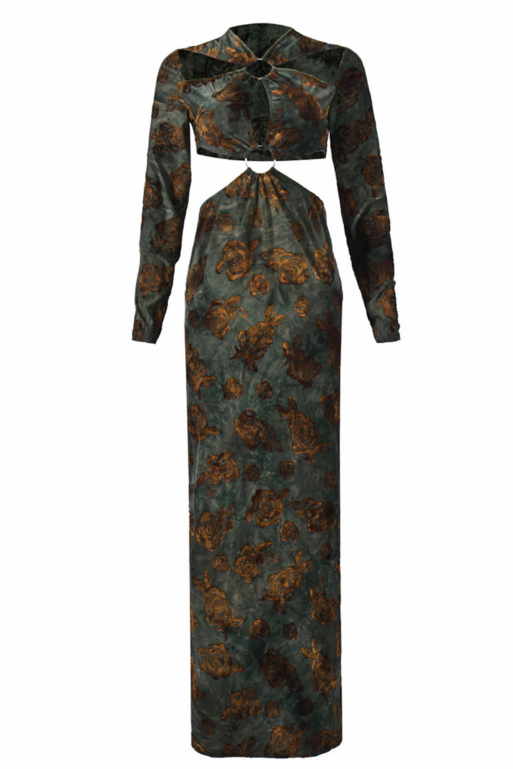 Long Sleeve Ring Cutout Floral Velvet Maxi Dress