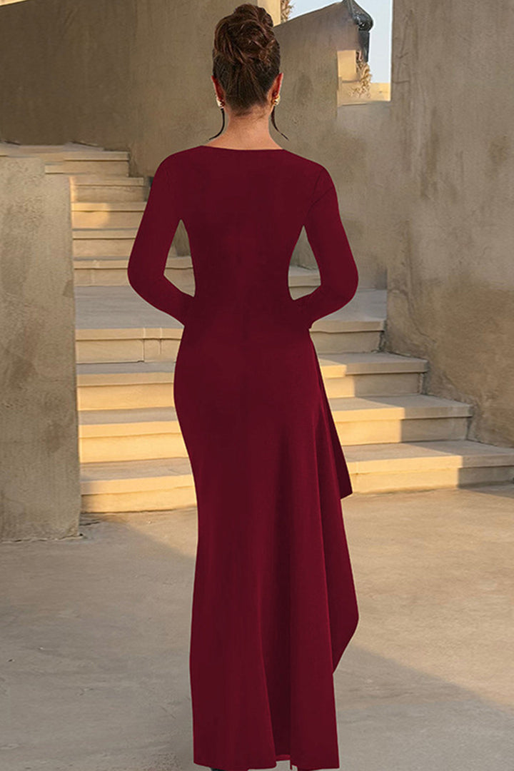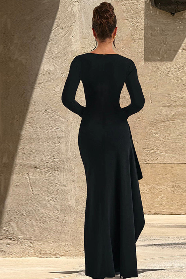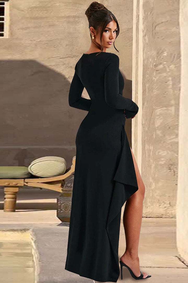 - Embrace timeless sophistication in this stunning gown, designed to captivate. The square neckline and long sleeves exude refined charm, while the daring high slit adds a modern, alluring edge. Crafted from premium stretch fabric, it hugs your curves flawlessly for effortless movement and confidence. Perfect for galas, dinners, or romantic evenings—pair with statement heels and minimalist jewelry to let the design shine. Step into the spotlight and own the night with unforgettable grace.