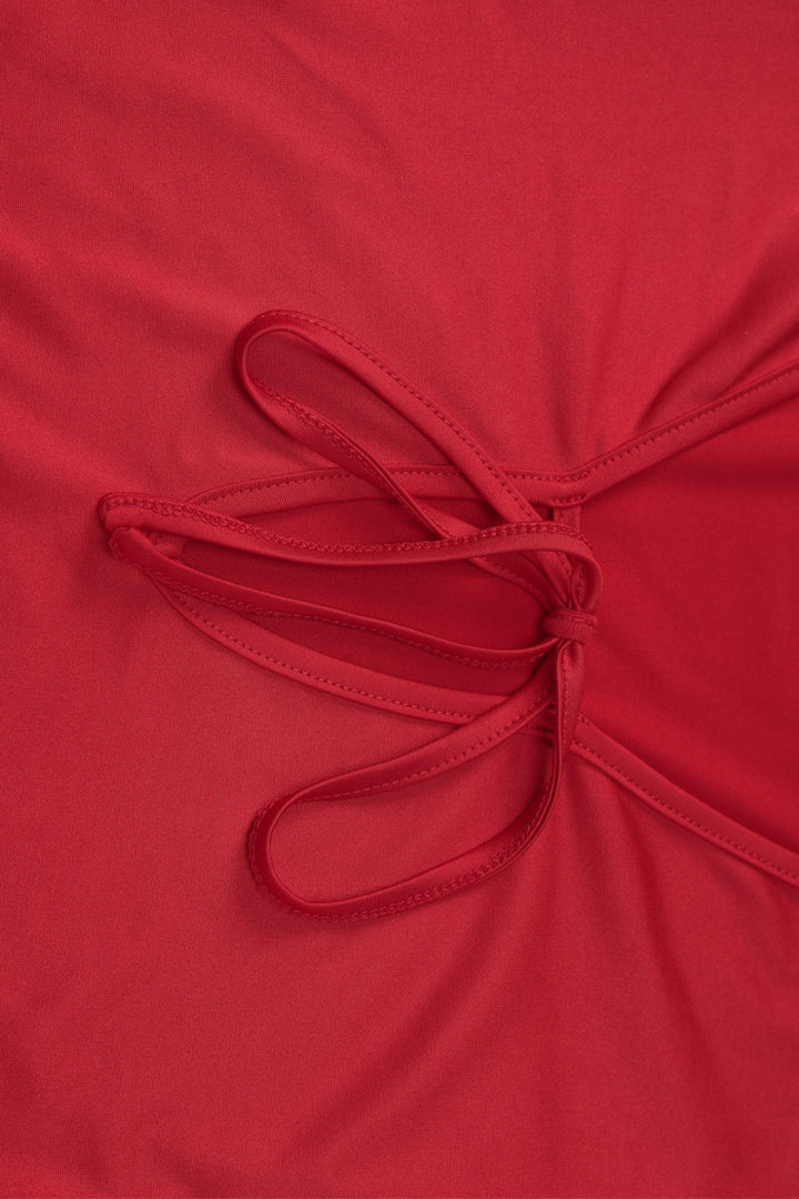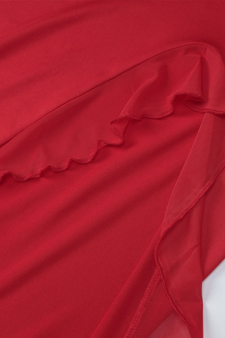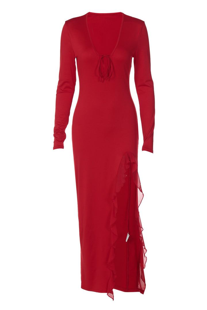 - Embrace timeless allure in this stunning gown, designed to captivate. The deep V neckline with delicate tie accents frames your decolletage, while the form fitting silhouette and thigh-high slit adorned with cascading sheer layers add drama and movement. Long sleeves offer refined sophistication, perfect for garden parties, weddings, or romantic evenings. Crafted from luxurious stretch fabric, it ensures both comfort and confidence. Pair with neutral heels and subtle jewelry to let the design shine. Step into a vision of elegance and grace.