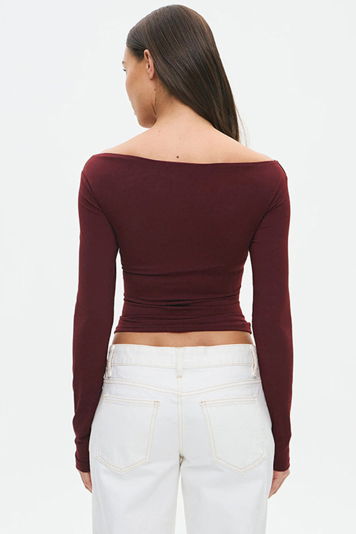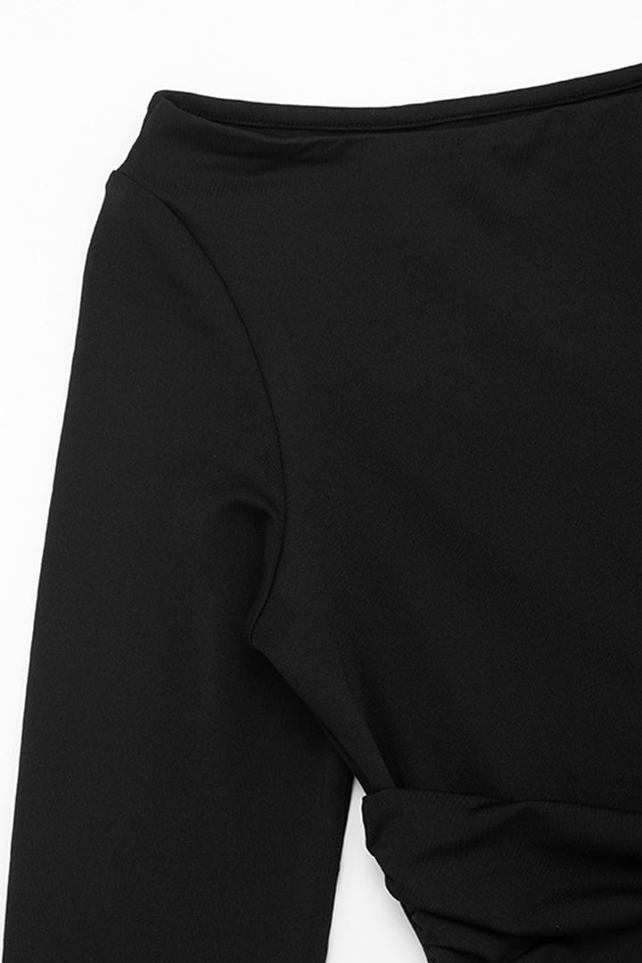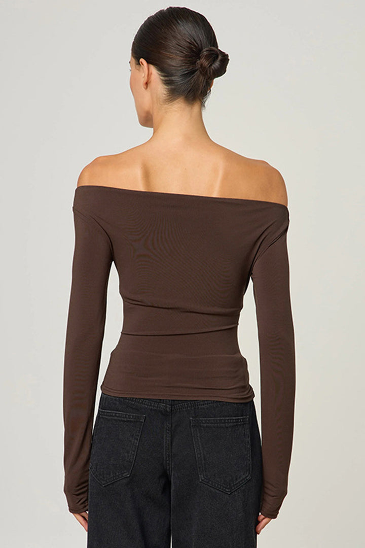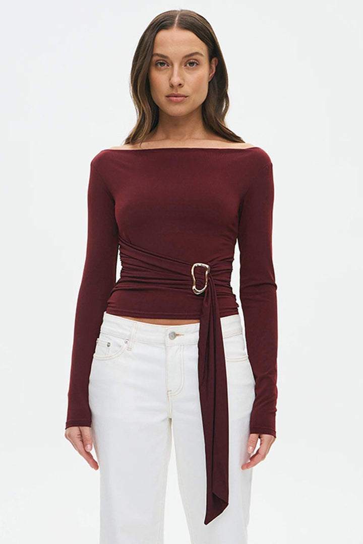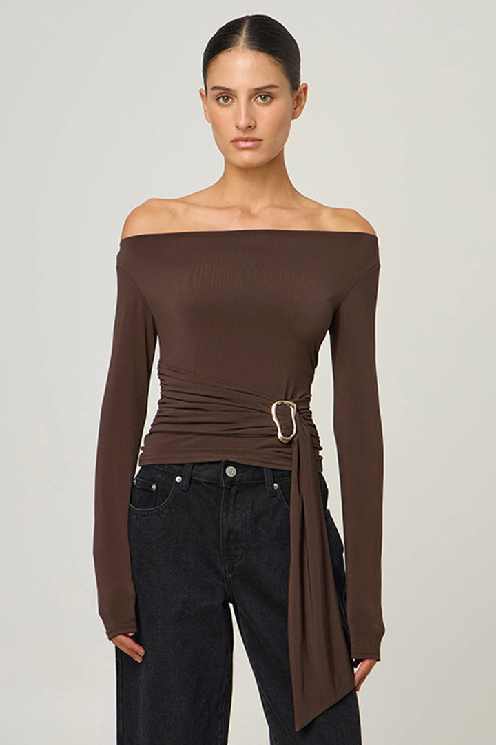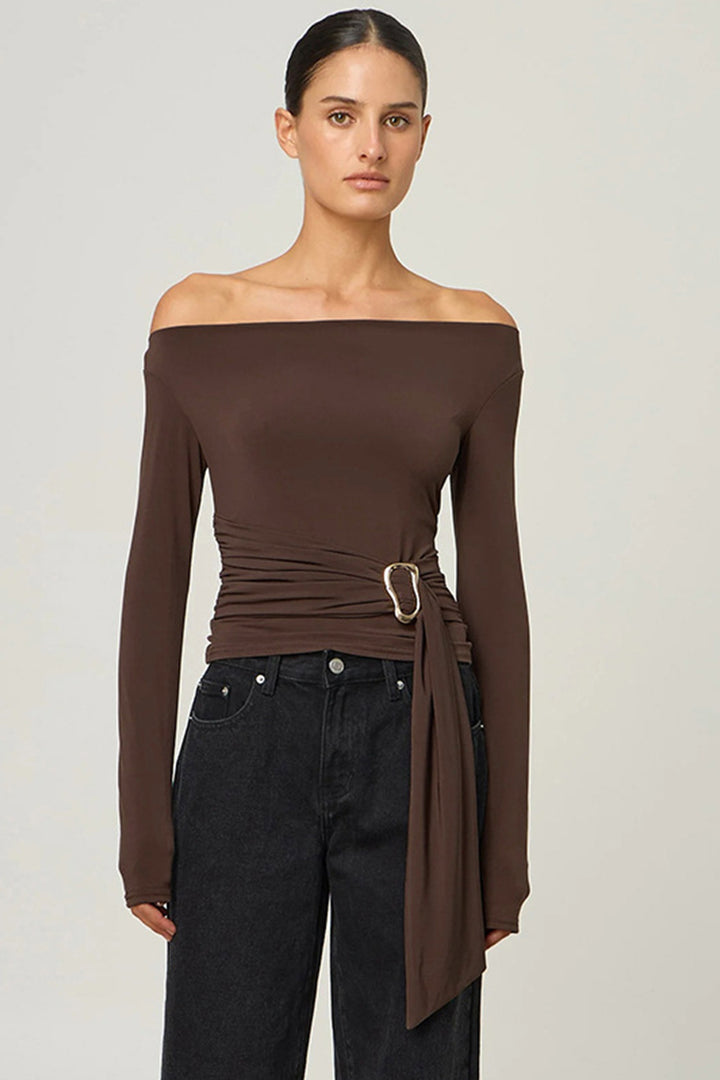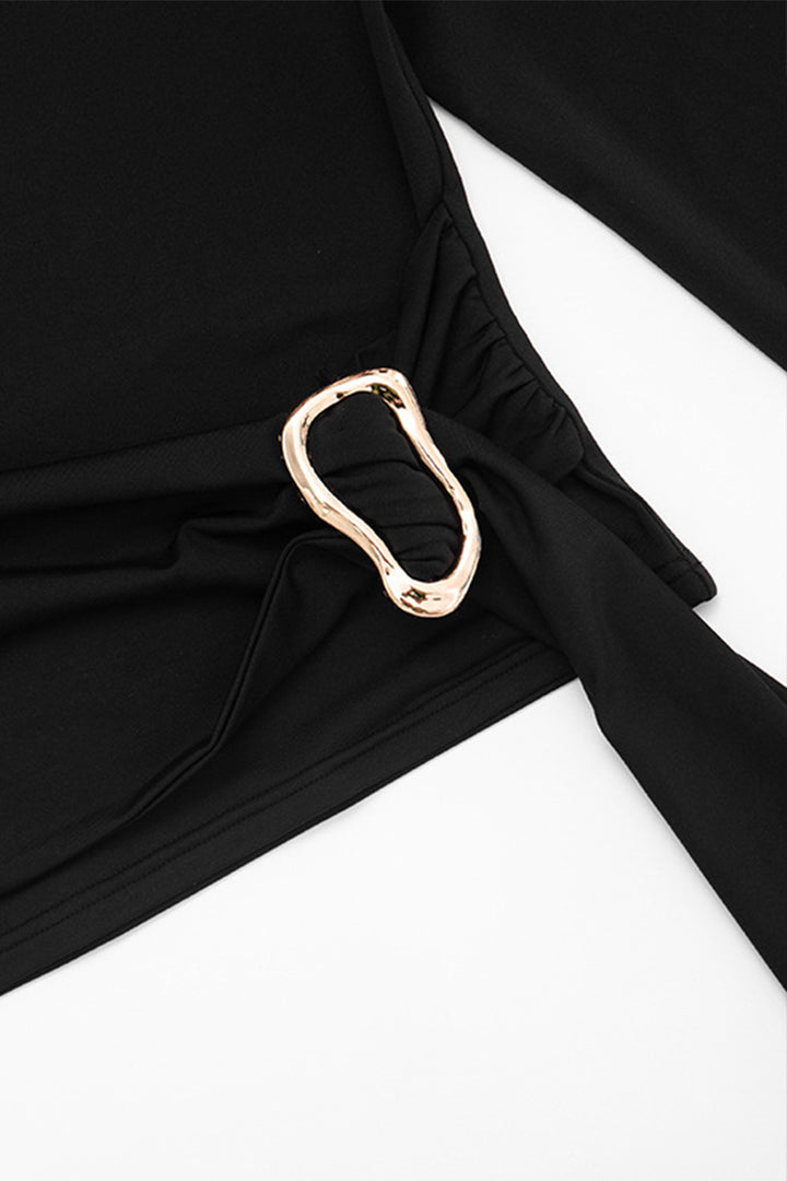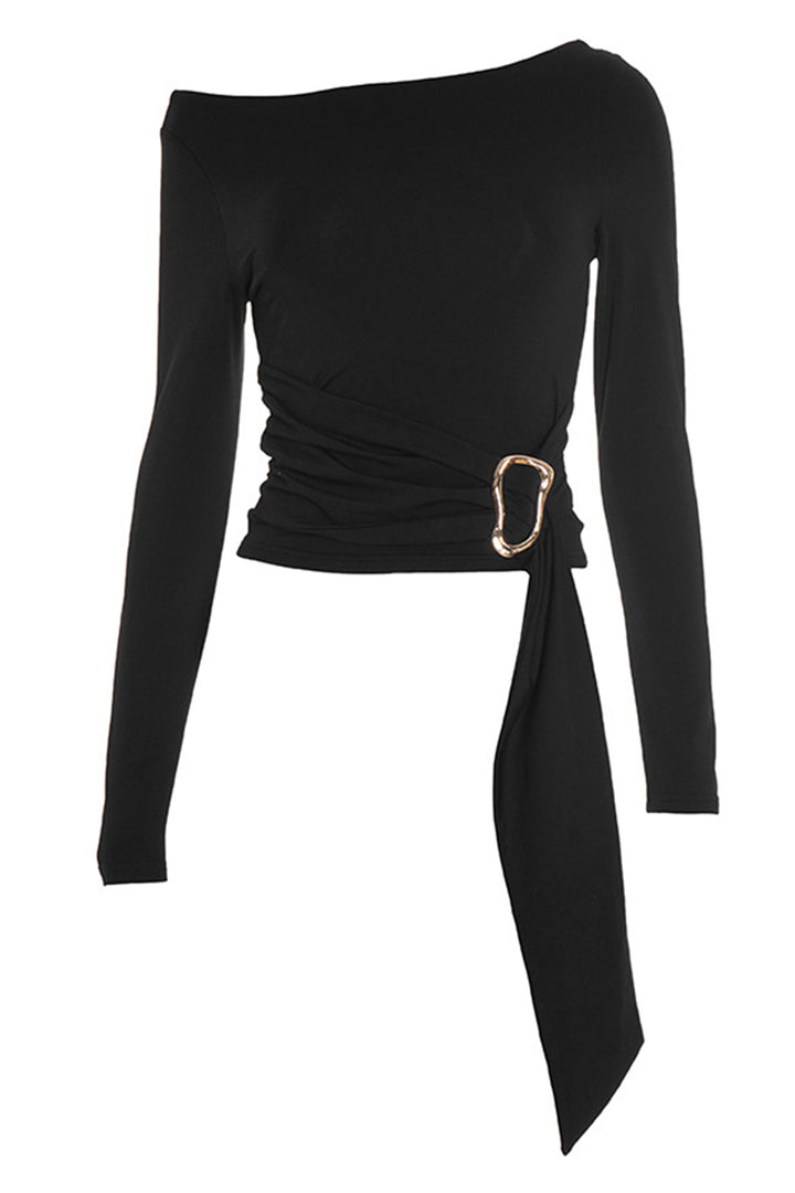 - Command attention in this sleek black off-the-shoulder top, designed to accentuate your silhouette with its form-fitting elegance. The striking gold-toned side buckle and fabric tie add a touch of edgy sophistication, while long sleeves balance allure with refinement. Crafted from premium stretch fabric, it pairs effortlessly with high-waisted pants or skirts for timeless contrast. Perfect for date nights or elevated casual wear—this piece seamlessly blends classic charm with modern daring. Own the room in style.