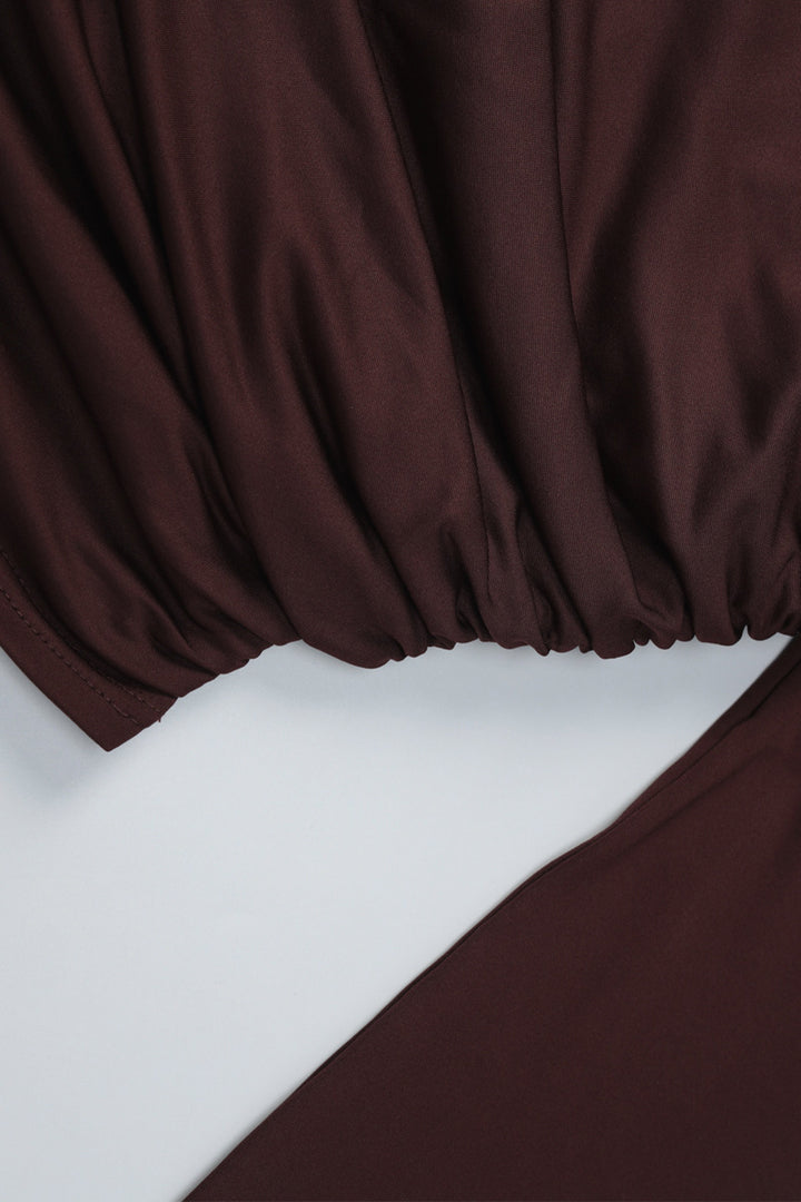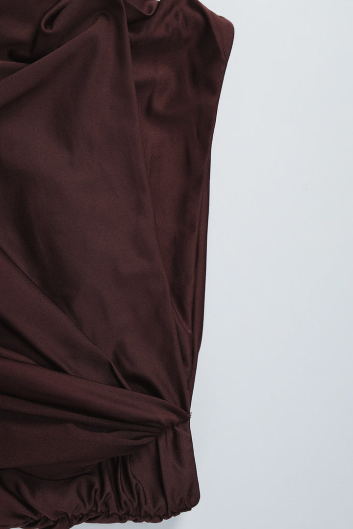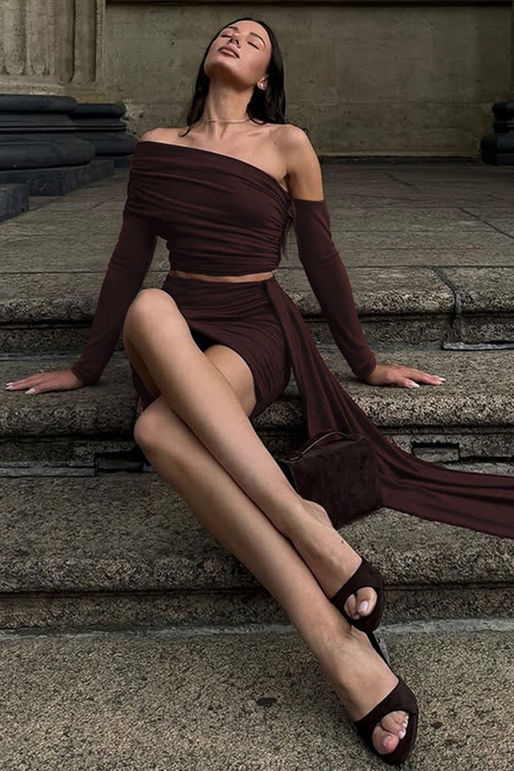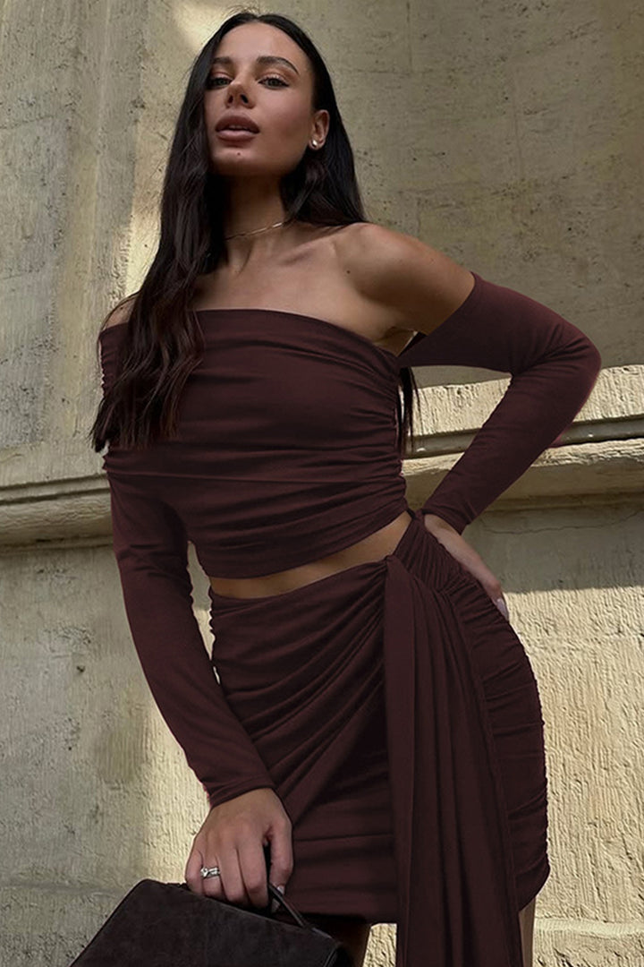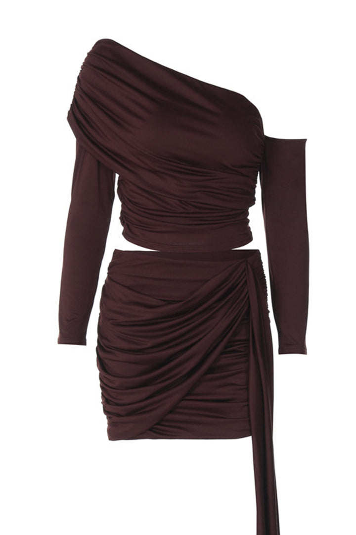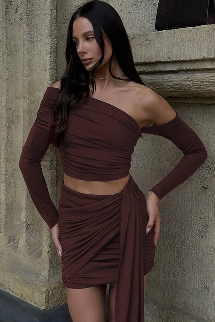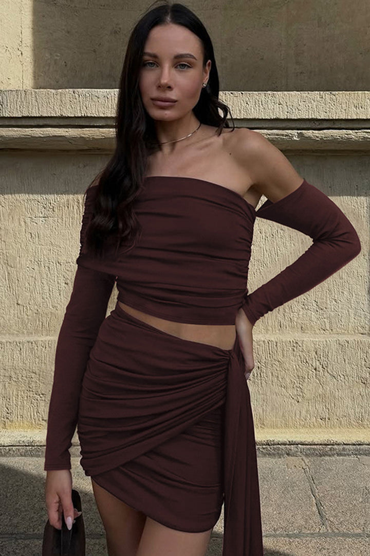 - Step into sophistication with our chic mini skirt set! The one-shoulder top with draped detailing and long sleeves exudes timeless elegance, paired with a high-waisted skirt featuring a playful side tie. Crafted from soft, stretchy fabric, it hugs your curves flawlessly for all-day comfort. Perfect for nights out or special occasions—pair with statement earrings and heels for a head-turning look. Effortlessly blend grace and confidence with this must-have ensemble.