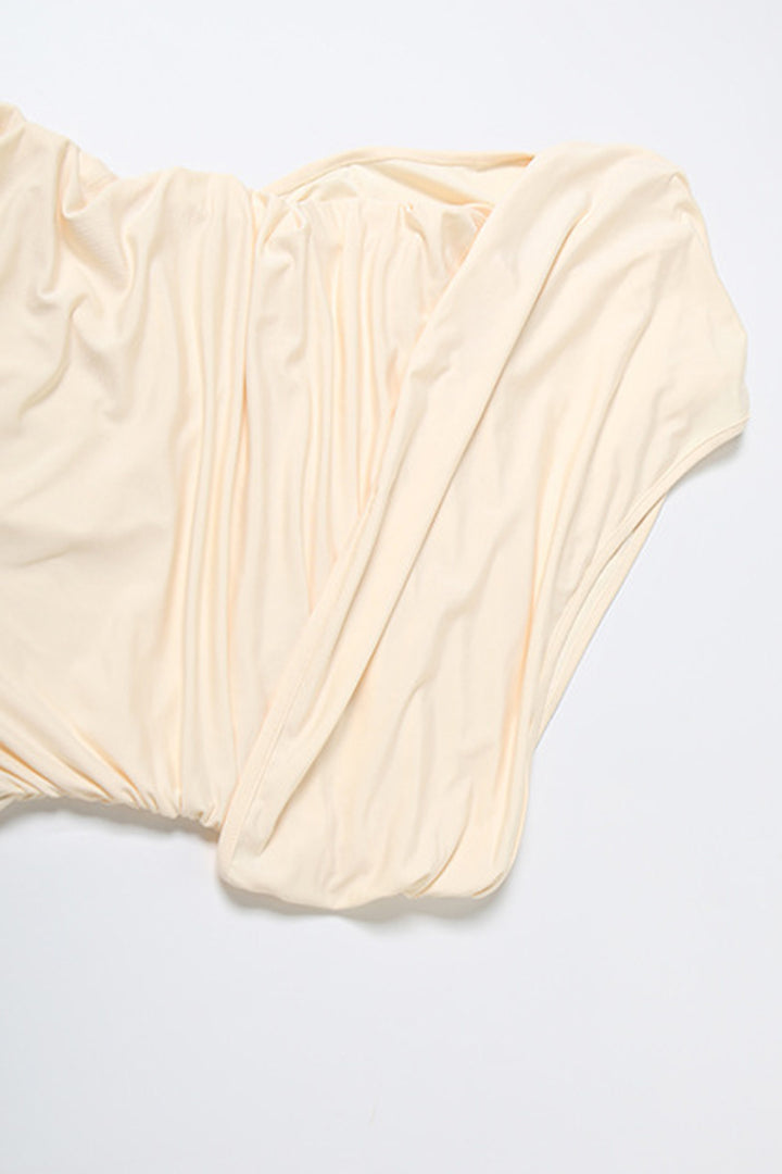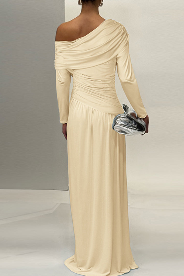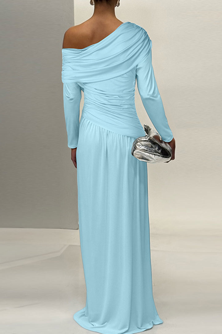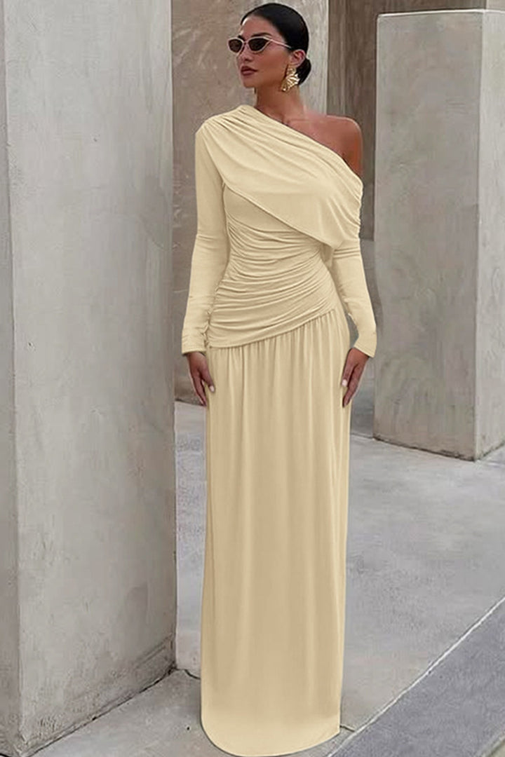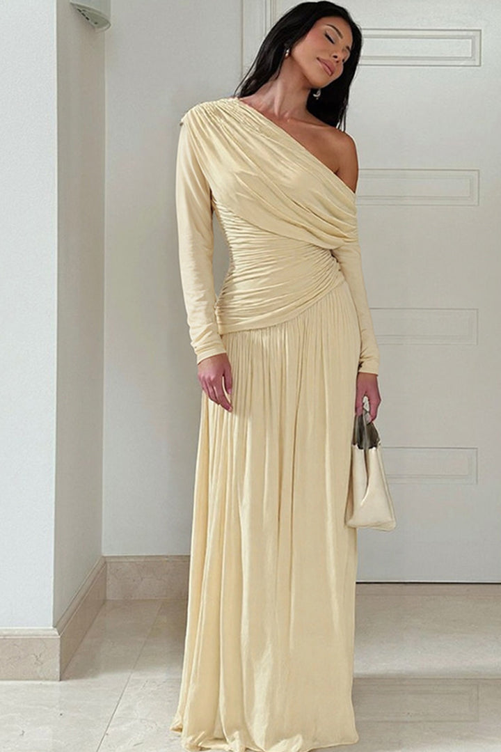 - Embrace timeless grace with this stunning gown, featuring a flattering one-shoulder neckline and delicate draping that sculpts your silhouette. The long sleeves and flowing skirt create a sophisticated yet modern look, perfect for weddings, galas, or romantic evenings. Crafted from premium lightweight fabric, it offers effortless movement and comfort. Pair with subtle silver accessories to let the soft hue shine. Designed for the woman who commands attention with subtlety and style—elevate your moments in this dreamlike dress.