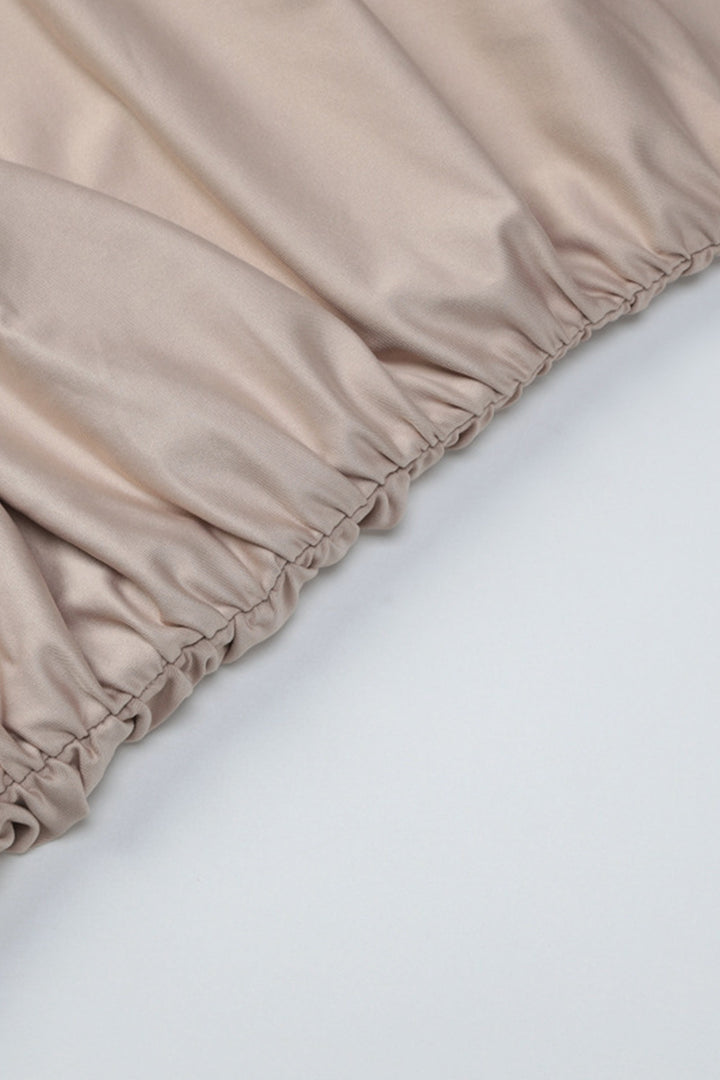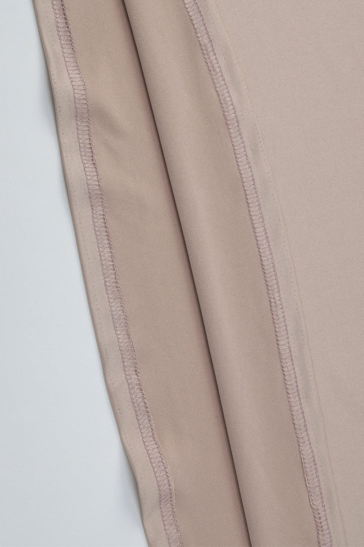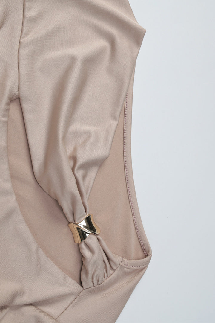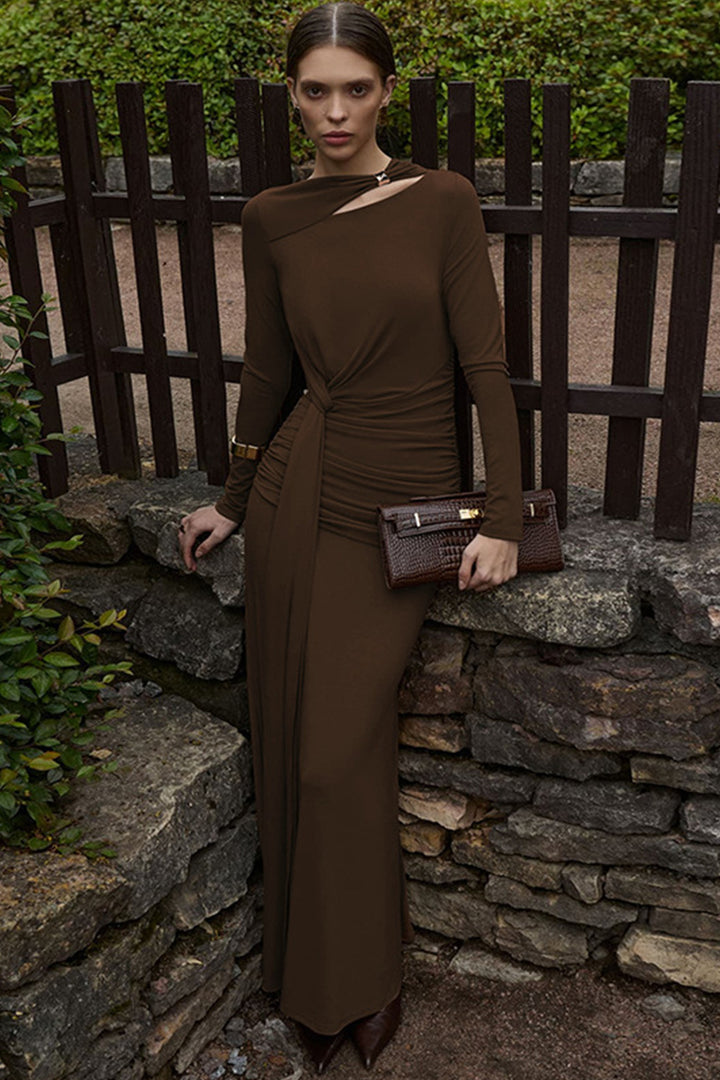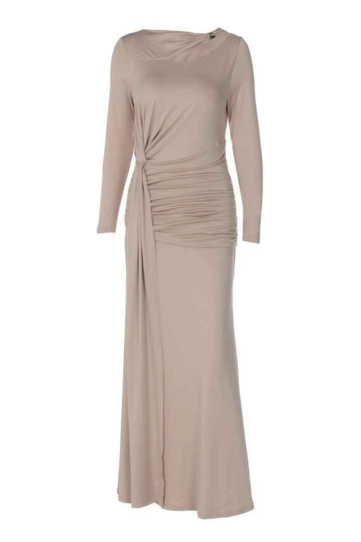 - Step into sophistication with our form fitting dress, designed to captivate. The elegant draped neckline and sculpted side detailing create a flattering silhouette, while long sleeves add refined grace. Crafted from premium stretch fabric, it offers both comfort and style for galas, dinners, or special evenings. Pair with gold accessories and a structured clutch as styled in our campaign for a cohesive, polished look. Effortlessly blend luxury and allure in this masterpiece of modern design.