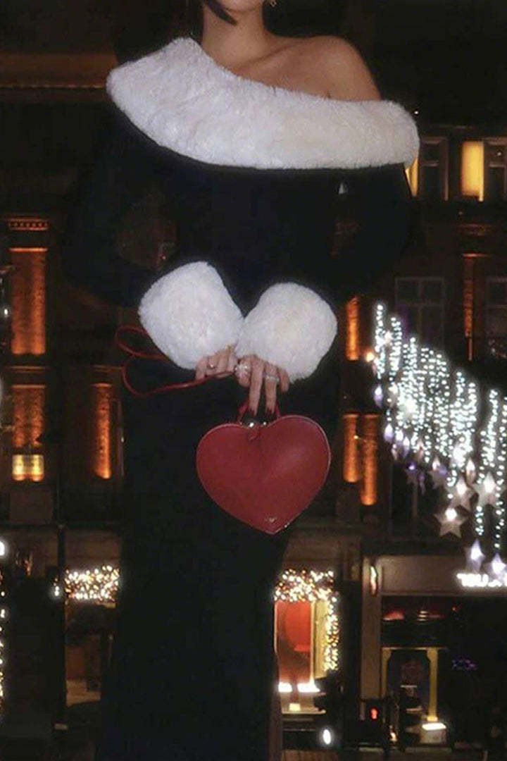 Slant Neck Faux Fur Knit Maxi Dress