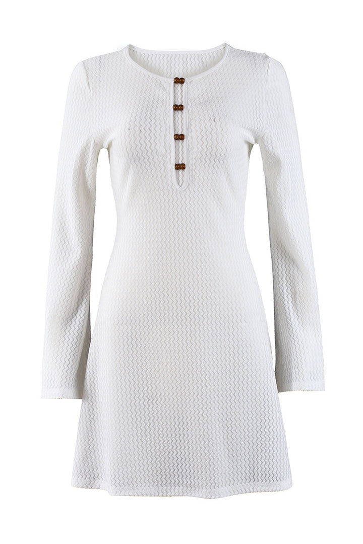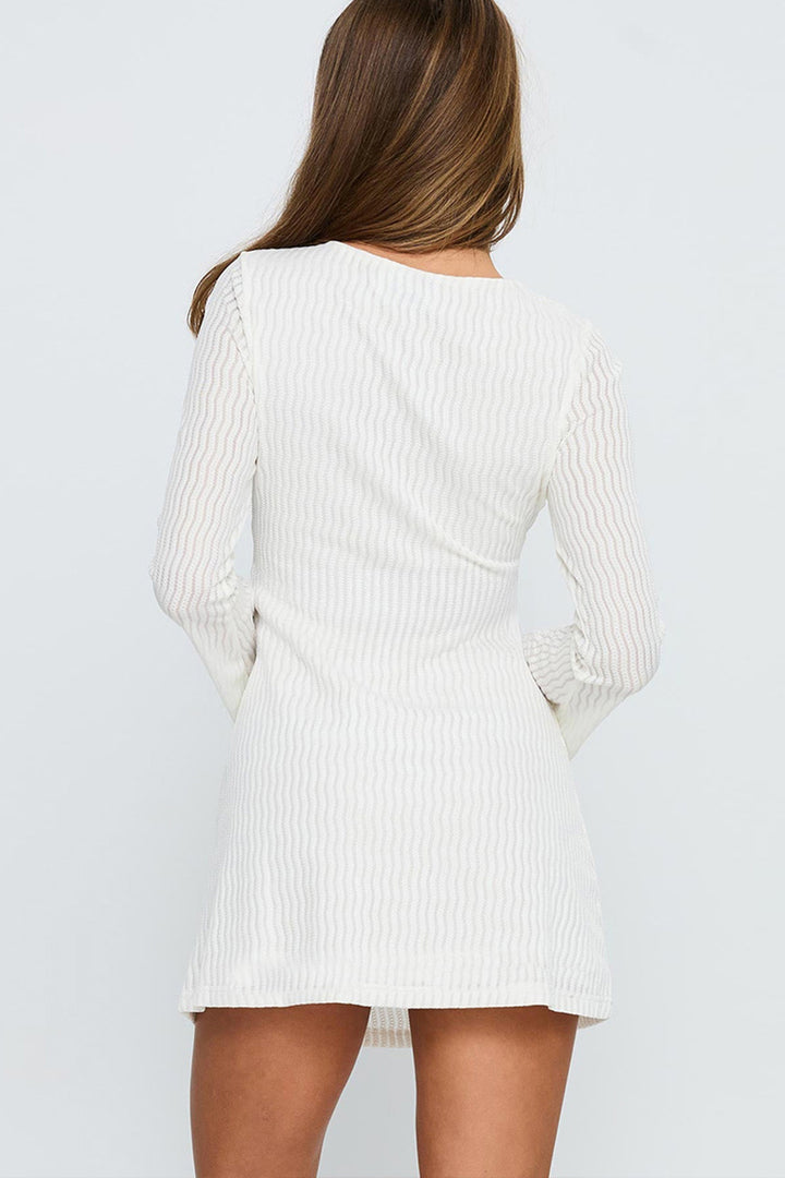 - Command attention in this striking white knitted mini dress, where edgy meets sophistication. The bold chest cut-out with metallic ring detailing adds a daring twist, while long sleeves with dramatic flared cuffs balance sharpness with grace. Soft, stretch-knit fabric hugs your curves for comfort and confidence. Perfect for nights out, dates, or making a statement—pair with boots and minimalist jewelry to let the design shine. For those who redefine bold elegance.
