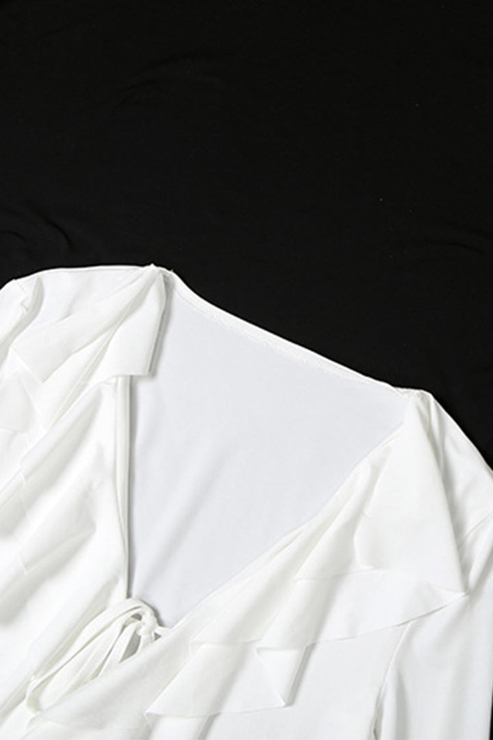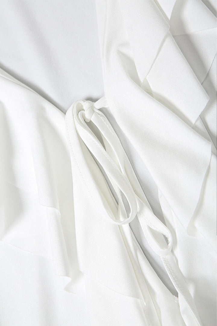 - Command attention in this stunning mini dress, designed for unforgettable moments. The daring deep V-neckline and cascading ruffles create a feminine yet bold statement, while flared cuffs add dramatic sophistication. Crafted from premium fabric, its asymmetrical hemline lends modern flair perfect for nights out or special events. Pair with delicate gold jewelry and a structured clutch for cohesive elegance. Embrace confidence, movement, and timeless allure—this dress ensures you’ll captivate from every angle.