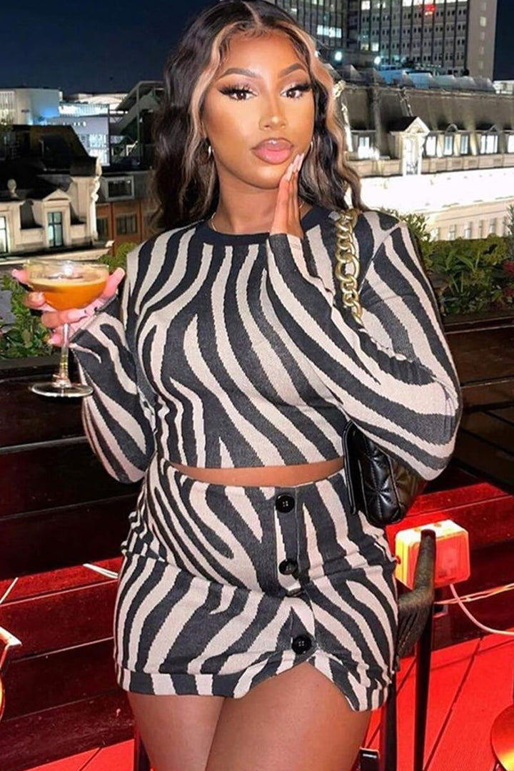 Zebra Long Sleeve Crop Top And Mini Skirts Set
