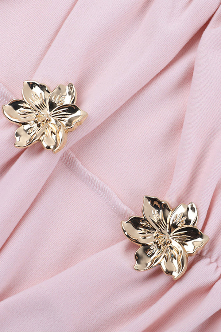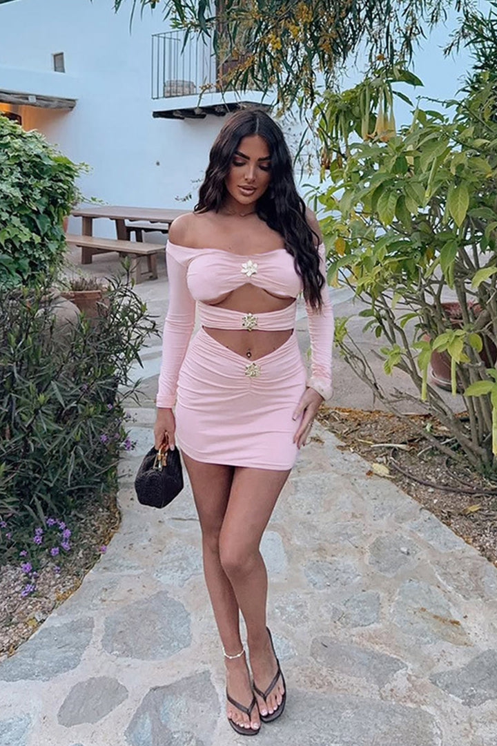 - Crafted from premium, stretchy fabric, this dress hugs your curves in all the right places. The off shoulder design flaunts your clavicle and shoulders, while the strategic cut - outs add a touch of daring allure. Adorned with delicate floral embellishments, it's both elegant and edgy.