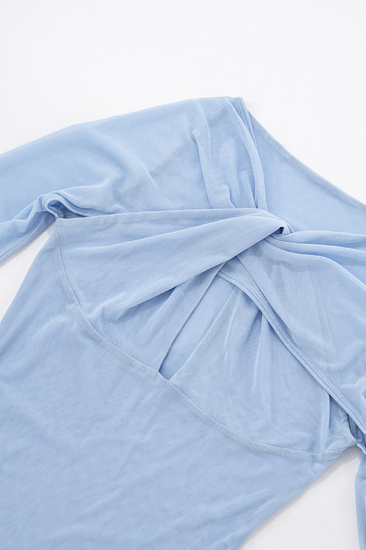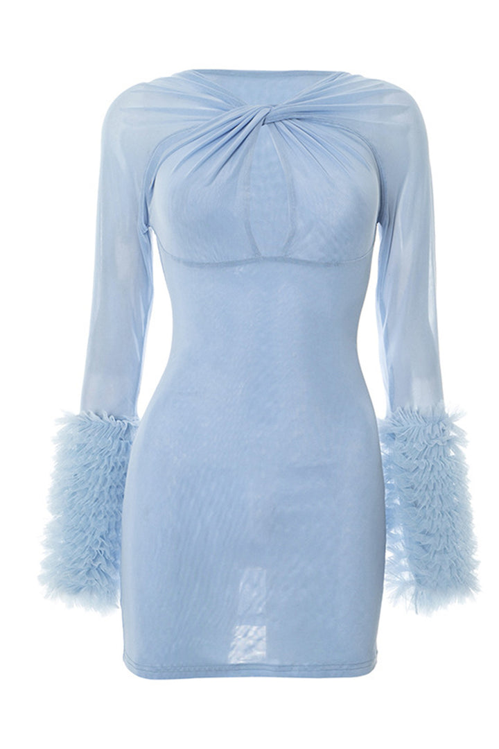 - Indulge in elegance with this bodycon dress. The knot front detail at the bust adds a touch of sophistication, while the sheer long sleeves with fluffy cuffs create a dreamy, luxurious look. Hugging your curves in all the right places, it's perfect for upscale dinners or cocktail parties. Slip into this dress and exude timeless charm.