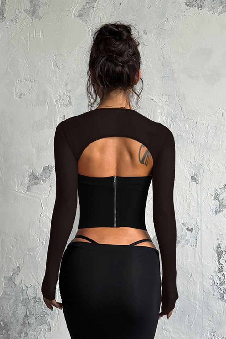 - This sculptural black sheer top features form-fitting boning and a sleek square neckline for stunning silhouette and flattering sculpting. Paired with a sheer, long-sleeved mesh cover-up, it adds a touch of mystery and edge, perfectly blending bold sophistication with sensuality. Whether for a night out or a high-end event, this top effortlessly pairs with a high-waisted skirt or statement trousers.
