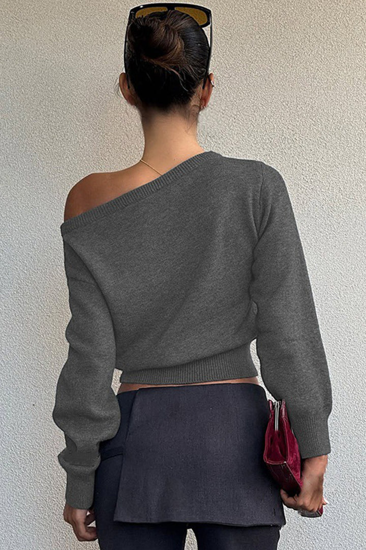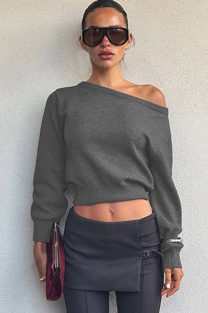 - Crafted for the modern minimalist, this soft sweater combines comfort and style with its relaxed fit and delicate off-shoulder design. The cropped length adds a playful touch, perfect for pairing with high-waisted skirts or jeans. Lightweight yet cozy, it’s ideal for daytime outings or elevated evening looks. Details like ribbed cuffs and a subtle neckline create timeless appeal. Versatile, chic, and irresistibly comfortable—this piece is your go-to for understated sophistication.