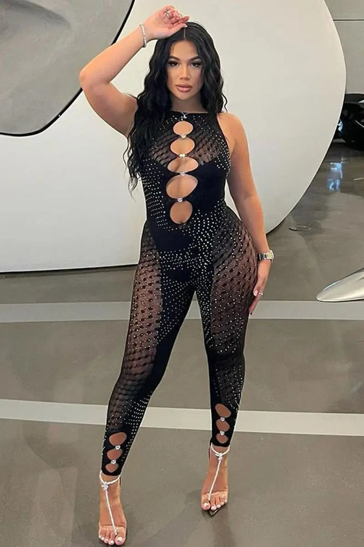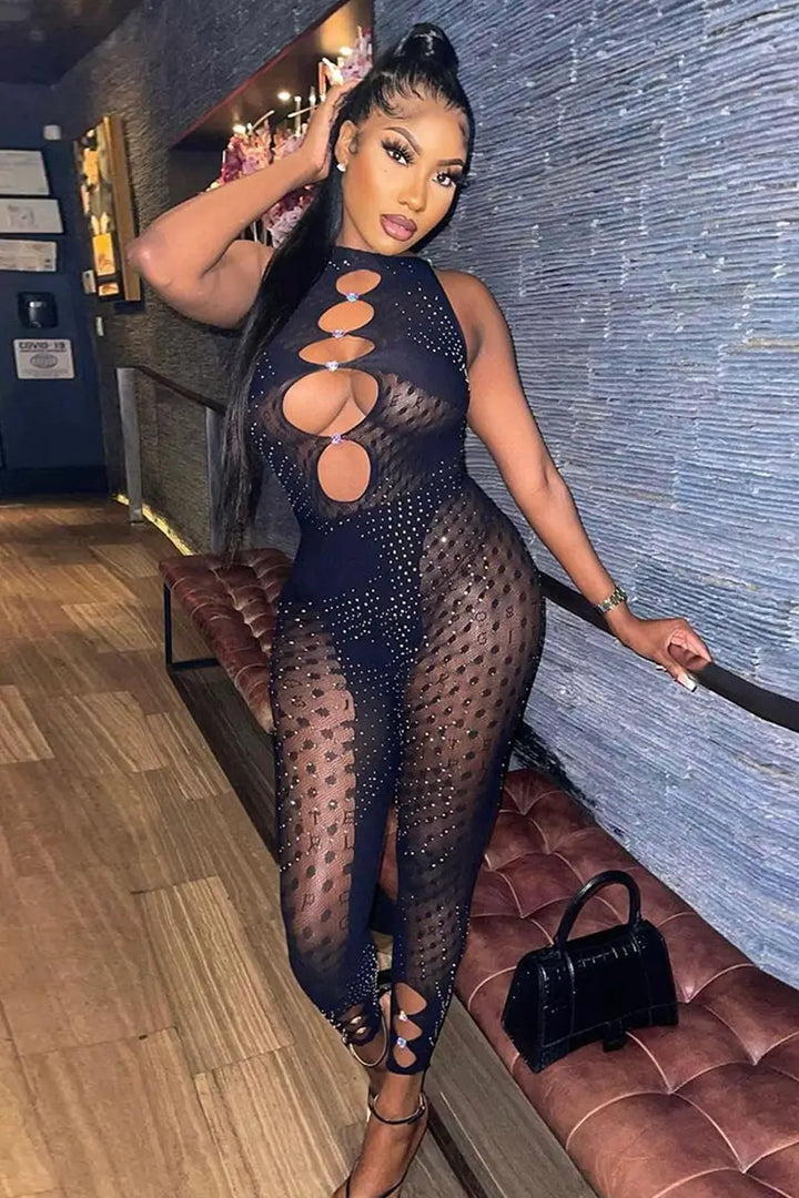 - Sparkling rhinestones and polka dots complement each other for a one-of-a-kind look. You can style it with a mini tote bag and heeled sandals. This jumpsuit is perfect for parties, clubs, proms, cocktail parties, makeup outfits, homecoming, anniversaries.