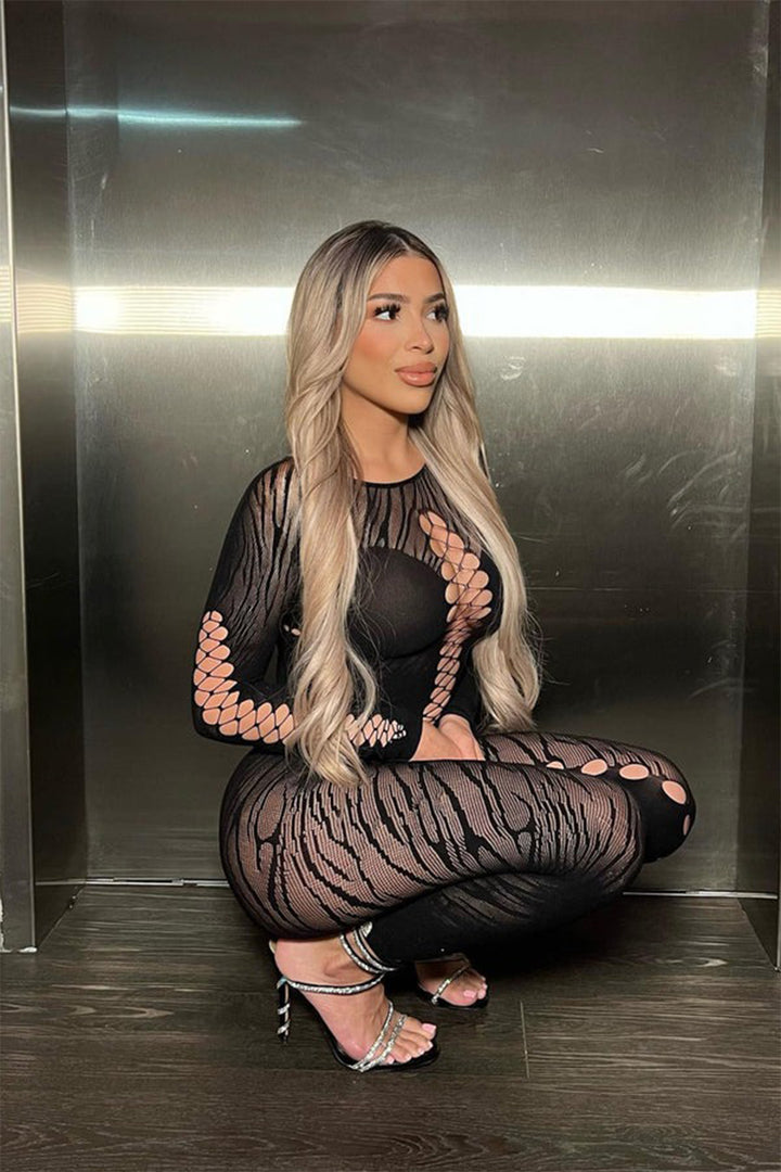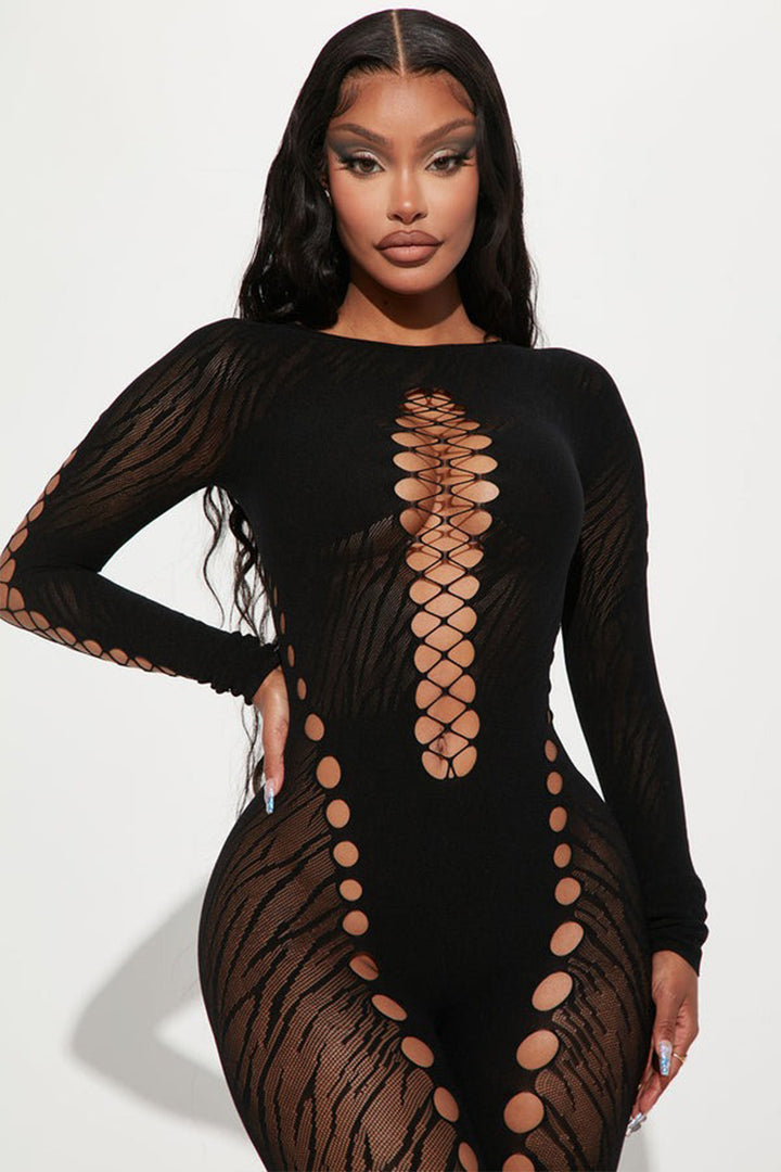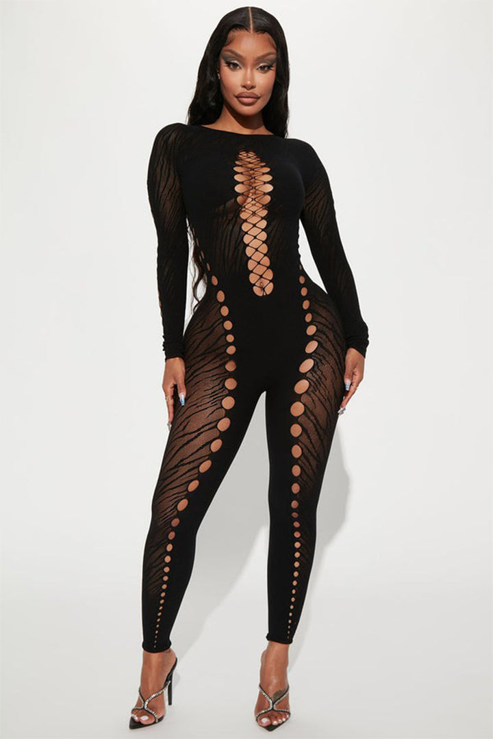 Black Zebra Stripe Round Neck Sheer Hollow Jumpsuit