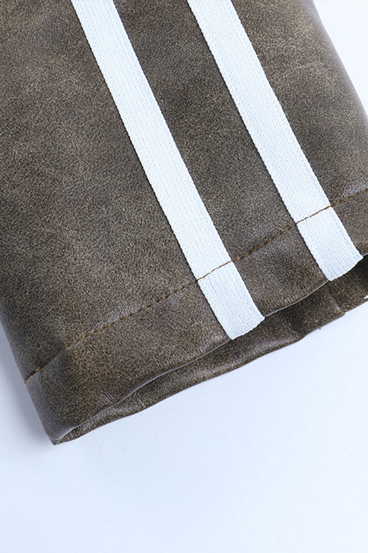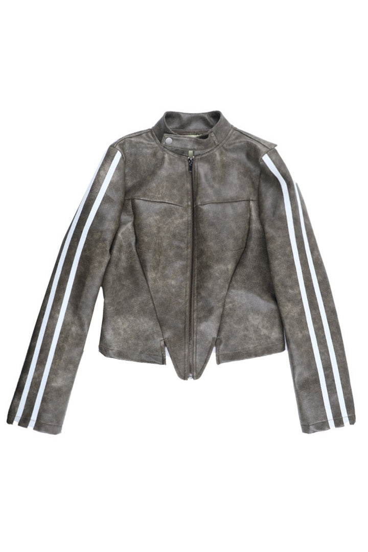 • Elevate your style game with our trendy cropped leather jacket! Crafted with precision, it features a sleek, high neck design that exudes an edgy charm. The unique color gives it a one of a kind look, while the white stripes on the sleeves add a sporty touch. The jacket hugs your curves perfectly, highlighting your figure in all the right places. It's not just a piece of outerwear; it's a statement of individuality.