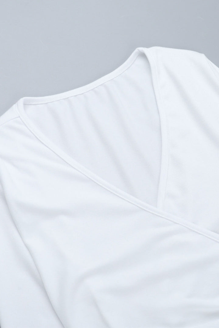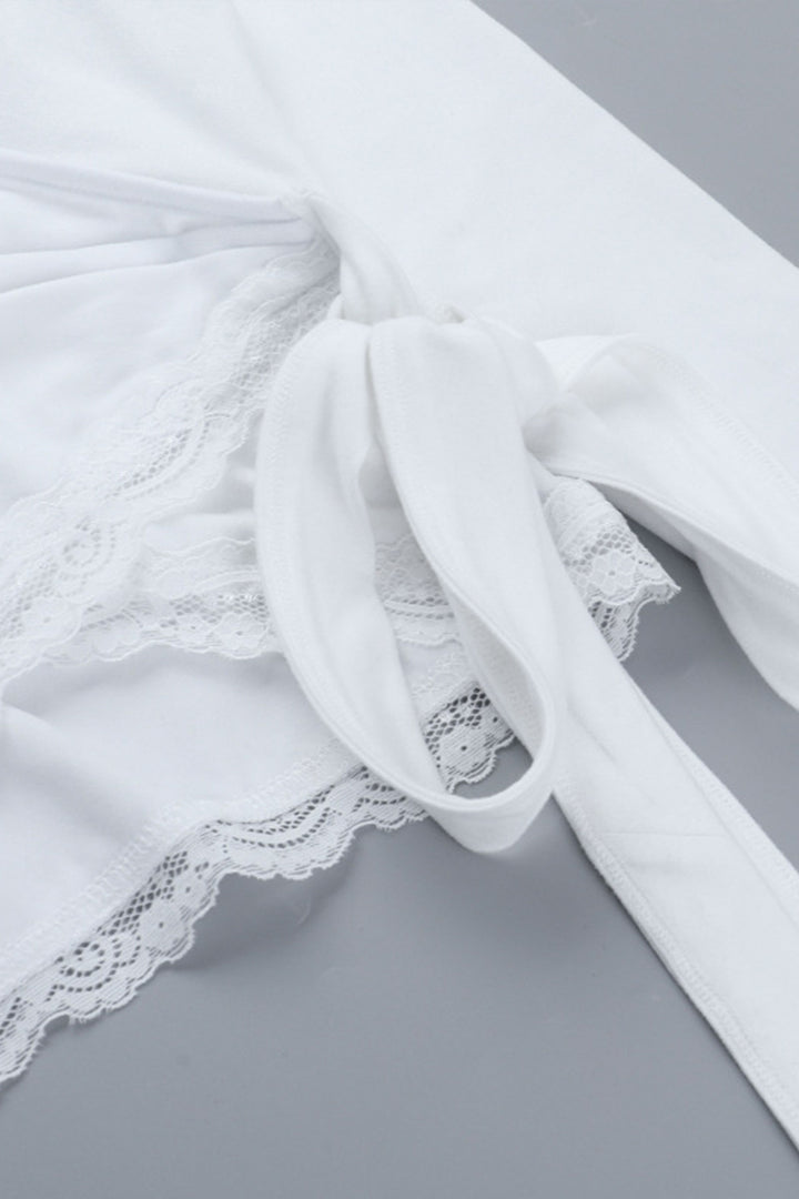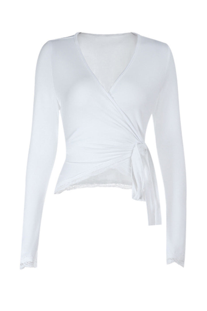 - Elevate your wardrobe with our exquisite white long - sleeve top! The deep V neck adds a touch of allure, while the delicate lace detailing at the cuffs and hem exudes femininity. The wrap around design with a tie at the waist not only flatters your figure but also gives you a customizable fit. Whether paired with jeans for a casual look or a skirt for a more formal occasion, this top is a versatile essential. Crafted from high quality fabric, it offers both comfort and style. Upgrade your fashion game and make a statement with this must - have piece!