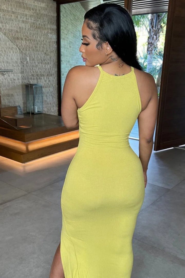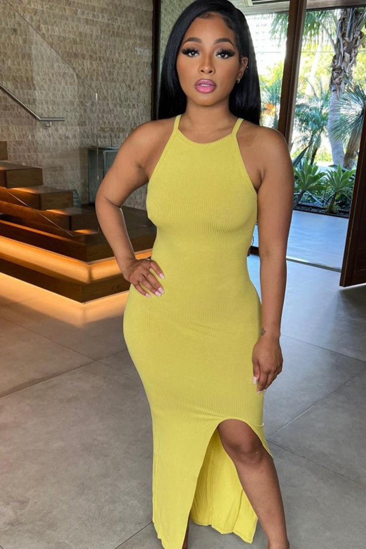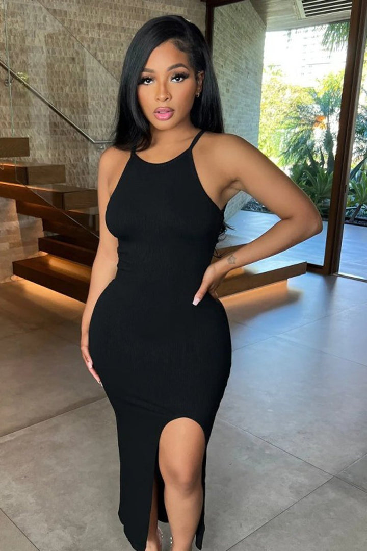 - This dress is a showstopper that's truly unique. Crafted with a luxurious stretch fabric, it's designed to hug your curves for a sleek, stylish silhouette. The split hem adds a modern touch to this classic sleeveless dress, perfect for making a chic statement. Dress to impress with this timeless piece!